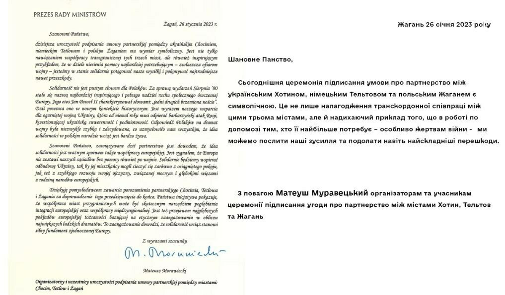 «Жагань і Тельтов уже багато років є містами-побратимами. А це перша така тристороння угода між органами місцевого самоврядування трьох країн у цьому регіоні. Документ передбачає співробітництво і взаємну підтримку у сфері соціальної, економічної та культурної діяльності», - написав Хотинський міський голова.