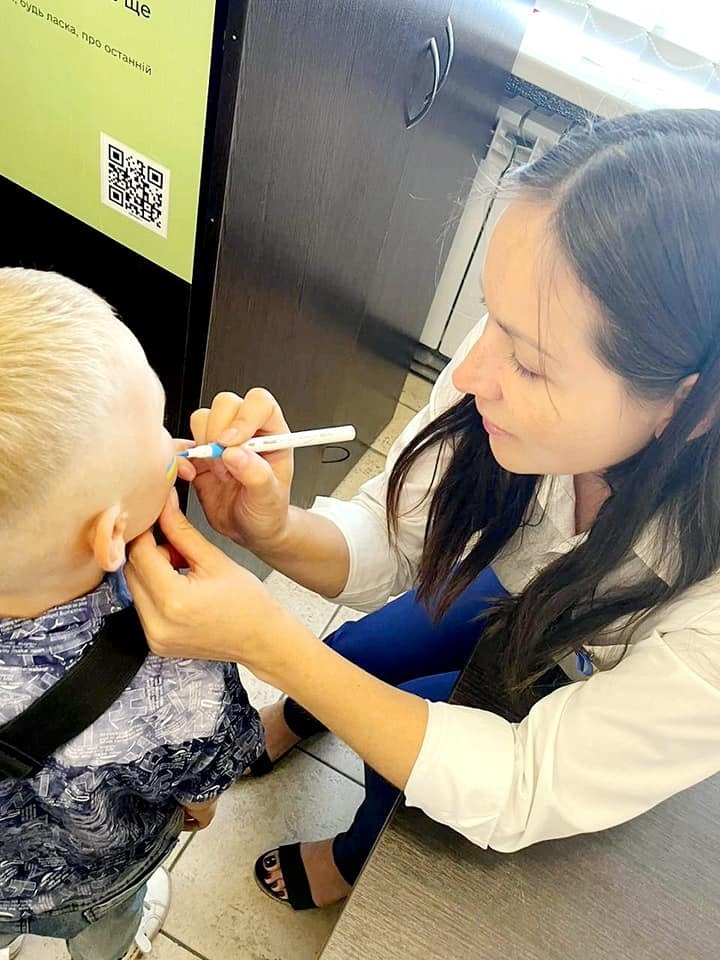 День державного прапора та День Незалежності України, адміністратор ЦНАП малює прапор на щічках малечі. Серпень, 2022 рік