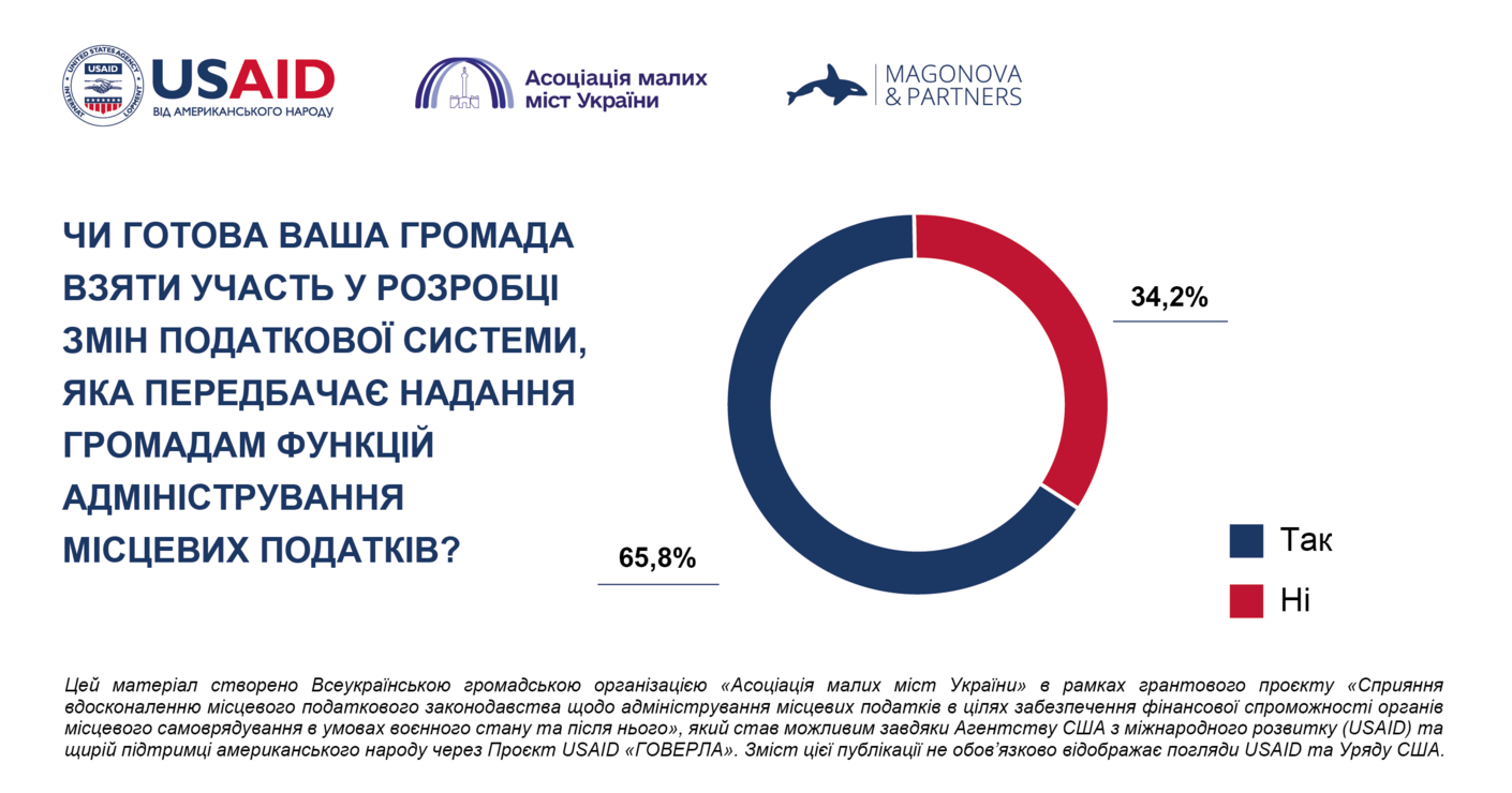 65,8% громад України готові взяти участь у розробці змін податкової системи, які передбачають підвищення ролі органів місцевого самоврядування у процесі адміністрування місцевих податків. Найбільшу готовність декларують селищні громади – 78,4% опитаних, готовність міських та сільських громад – 58,1% та 61,5% відповідно.