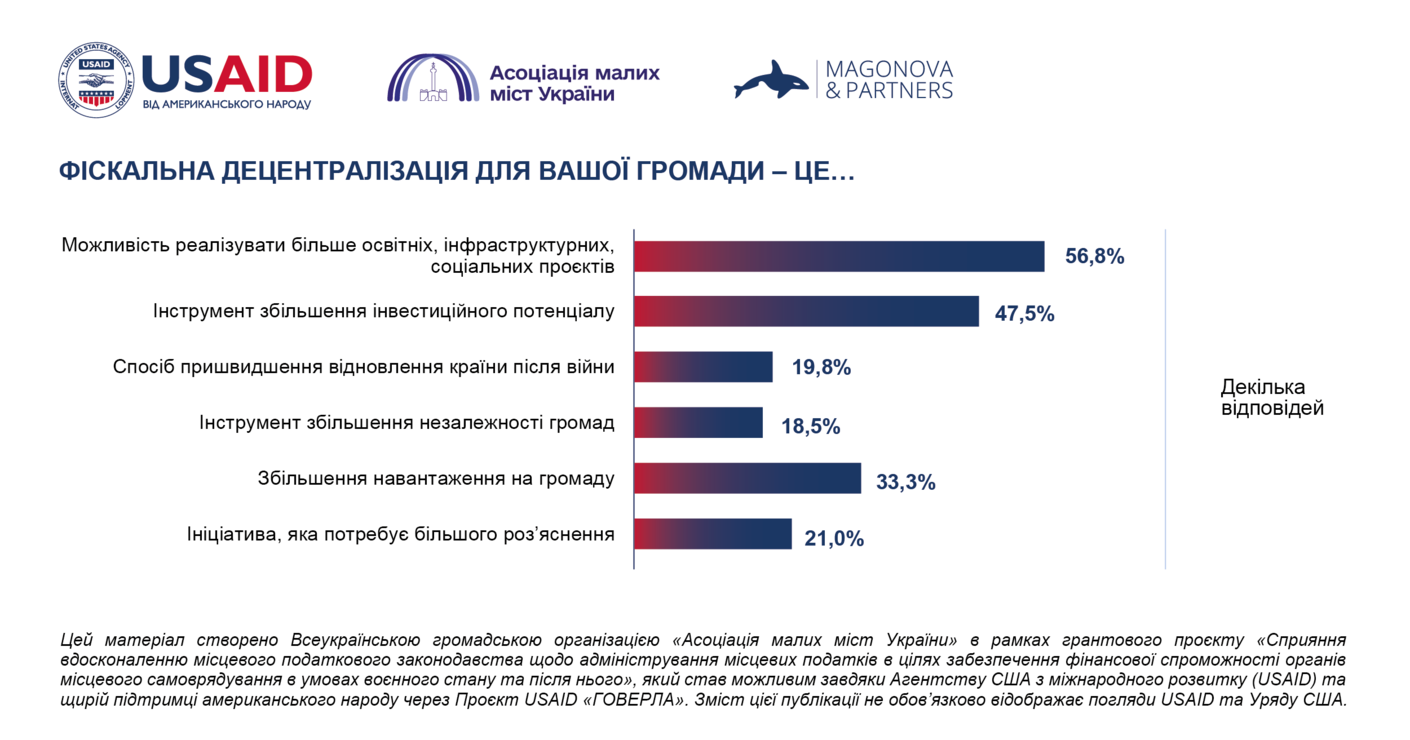 Фіскальна децентралізація є можливістю реалізувати більше освітніх, інфраструктурних, соціальних проєктів (так вважають 56,8% опитаних), інструментом збільшення інвестиційного потенціалу (47,5%), способом пришвидшенням відновлення країни після війни (19,8%), інструментом збільшення незалежності громад (18,5%). При цьому 33,3% опитаних вважають, що фіскальна децентралізація може означати збільшення навантаження на громади, а 21% респондентів потребують більше інформації про концепцію реформи.