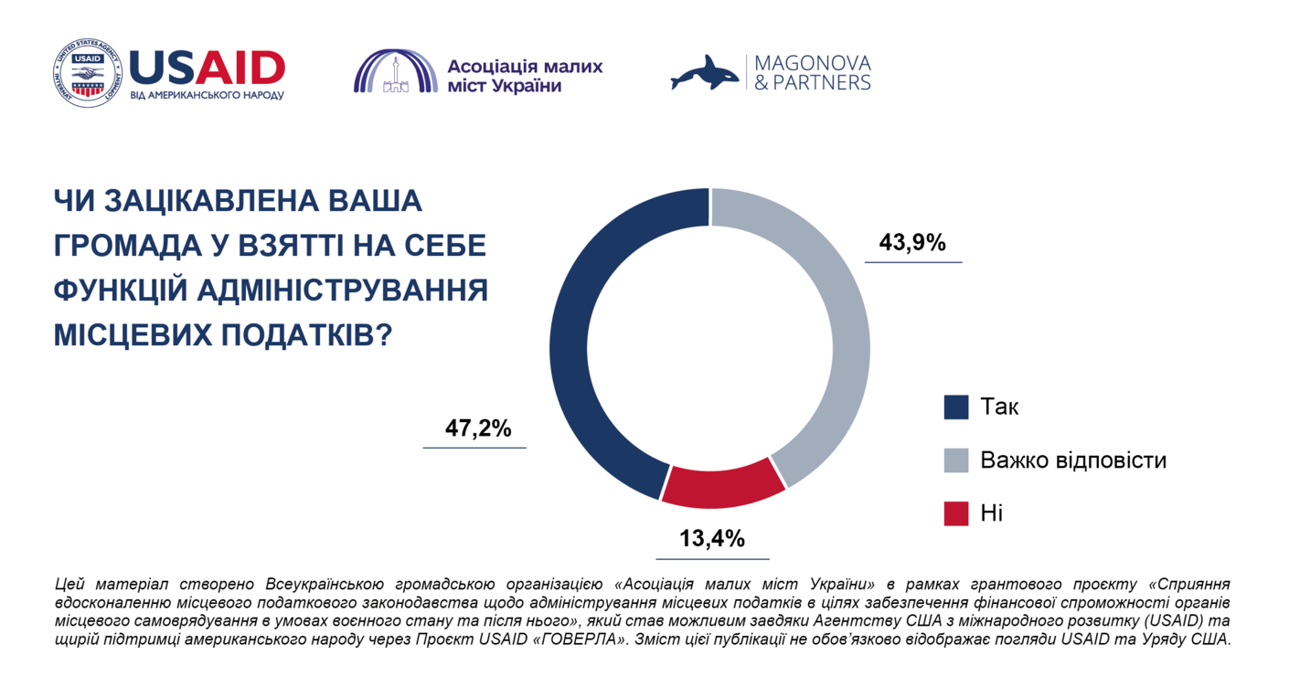 Про це свідчать результати опитування громад, проведеного Асоціацією малих міст України в січні-лютому 2023 року. Опитування було проведено у межах реалізації Асоціацією малих міст України та GR-компанією «Магонова і партнери» проєкту «Сприяння вдосконаленню місцевого податкового законодавства щодо адміністрування місцевих податків в цілях забезпечення фінансової спроможності органів місцевого самоврядування в умовах воєнного стану та після нього» за підтримки Проєкту USAID «ГОВЕРЛА».