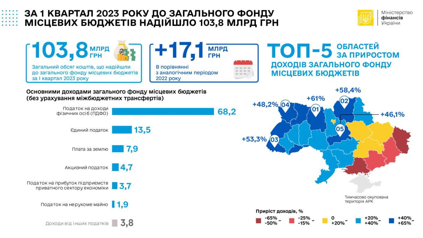 За перший квартал 2023 року до загального фонду місцевих бюджетів надійшло 103,8 млрд грн, що на 17,1 млрд грн більше порівняно з аналогічним періодом 2022 року.