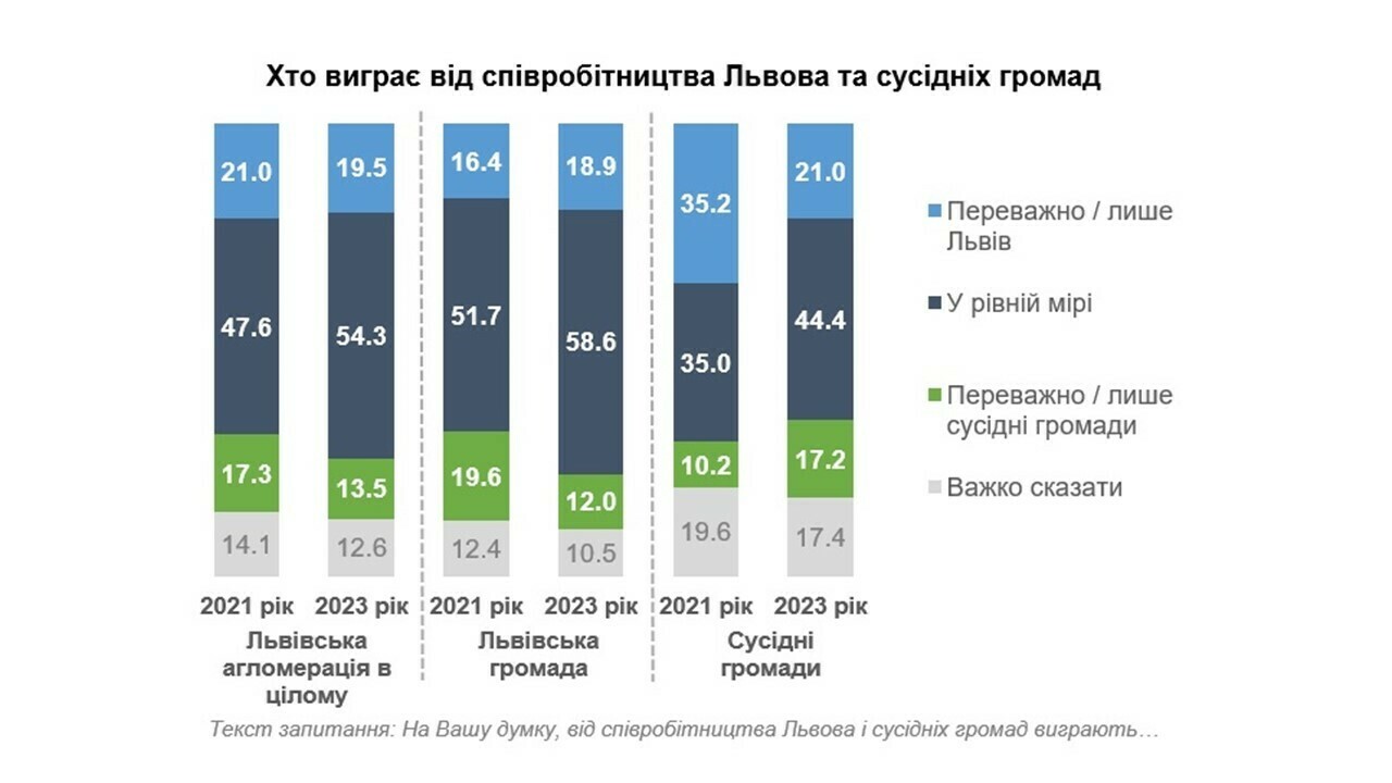 З цим, можливо, пов’язане і те, що у Київській агломерації дещо вищі оцінки взаємовигідності такої співпраці – 73% мешканців та мешканок м. Київ і 67% мешканців та мешканок інших населених пунктів Київської агломерації вважають, що від співробітництва виграє і м. Київ, і сусідні громади. У Львівській агломерації взаємовигідною таку співпрацю вважають наразі дещо менше опитаних. Але й тут маємо позитивні тренди – число тих, хто вважає, що у виграші від співпраці в рівній мірі будуть і Львів, і сусідні громади, виросло з 52% до 59% у Львівській громаді і з 35% до 44% – у сусідніх громадах. Слід зазначити, що у сусідніх громадах ще 17% вважають, що вони виграють від такої співпраці навіть більше.