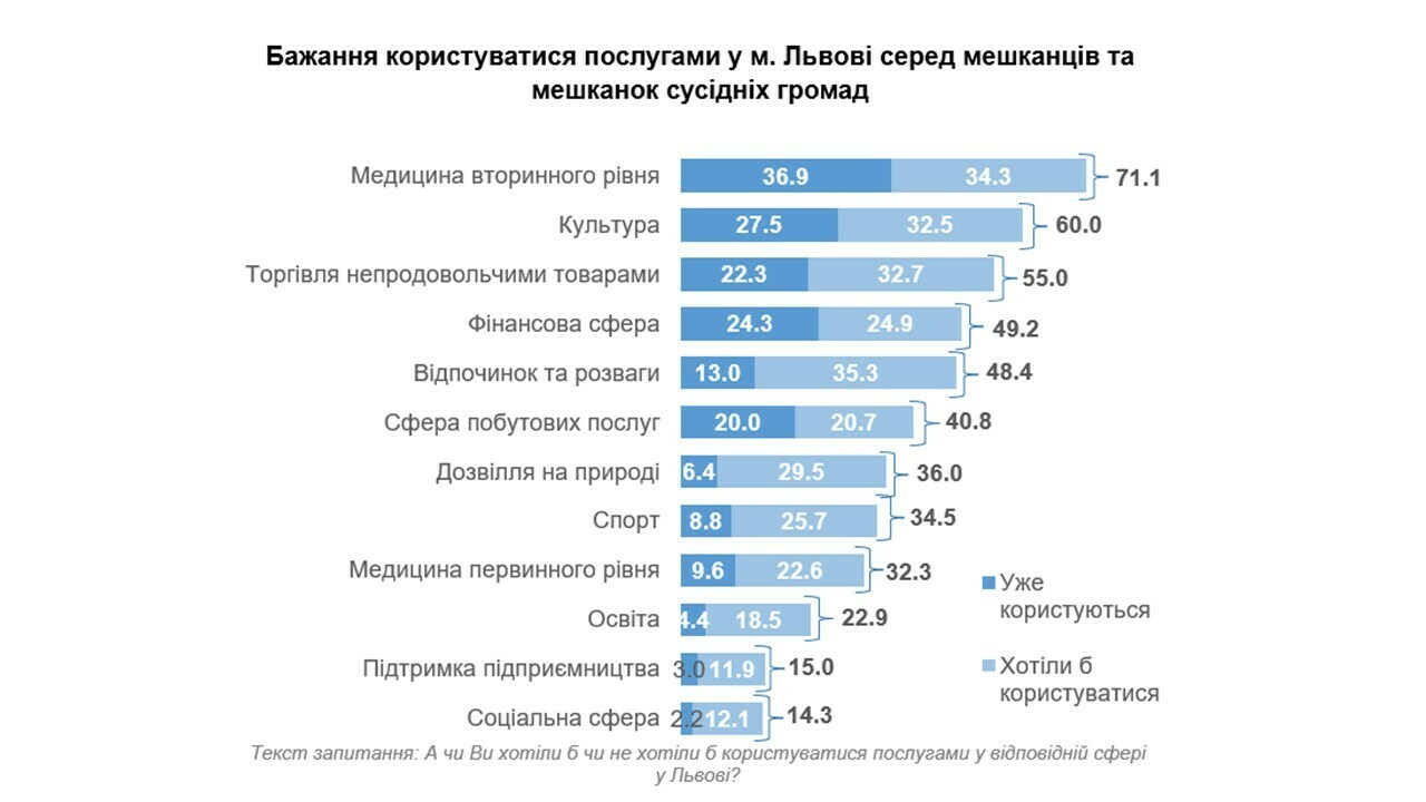 Тим більше, що вже сьогодні в багатьох сферах надання послуг існують тісні переплетення. Загалом у дослідженні мова йшла про 12 сфер, важливих з точки зору споживачів, незалежно від того, чи ці послуги надаються державними, комунальними чи приватними структурами. І хоча більшість з них мешканці та мешканки отримують саме у своїх громадах, є ряд сфер, де вже простежується інтенсивне залучення м. Львова. Так, сфери, послугами яких значна частка мешканців та мешканок сусідніх громад переважно користуються вже у м. Львові – це медицина вторинного рівня (39% серед тих, хто користується, говорять про переважне користування у м. Львові), культура (34.5%), фінансова сфера (26.5%), торгівля непродовольчими товарами (23%) і сфера побутових послуг (21%). А запит на отримання таких послуг саме в центрі агломерації ще більший. Так, серед мешканців та мешканок хотіли б користуватися послугами в центрі агломерації у сфері медицини вторинного рівня (загалом 71% з тими, хто уже користується) та у сфері культури (60%). Далі йдуть торгівля непродовольчими товарами (55%), фінансова сфера (49%), відпочинок і розваги (48%).