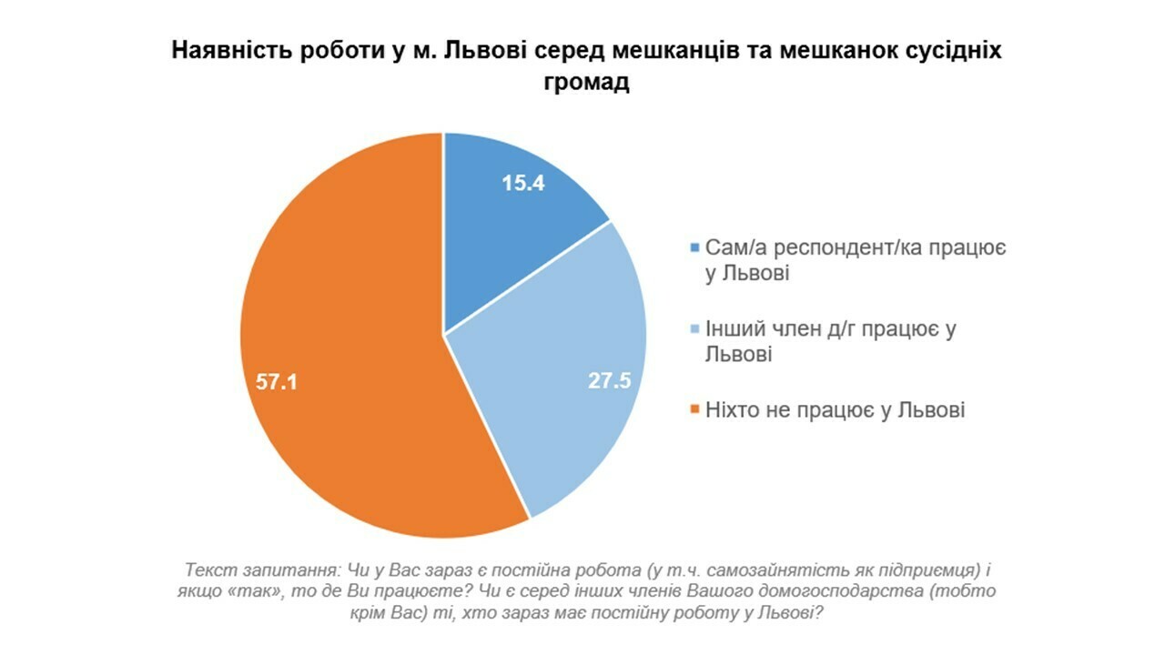 Ще більш сильним показником пов’язаності громад є дані, які свідчать, що в агломерації фактично формується єдиний ринок праці. У сусідніх громадах більшість працевлаштованих працюють у своєму населеному пункті, проте значна частина працює у м. Львові. Загалом 15% серед усіх мешканців та мешканок сусідніх громад працюють у м. Львові, що становить 29% серед працевлаштованого населення сусідніх громад. Крім 15% тих, хто самі працюють у м. Львові, є 27.5% респондентів та респонденток, які самі не працюють, але у яких є члени домогосподарства, що зараз мають роботу у м. Львові. Тобто загалом 43% мешканців та мешканок сусідніх громад безпосередньо або опосередковано пов’язані із сферою працевлаштування у м. Львові. На рівні ближніх до Львова громад ці показники ще вищі.