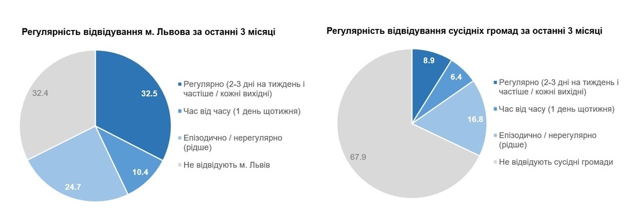 Наявність таких диспропорцій створює переважання «доцентрових» транспортних потоків над «відцентрованими». Якщо враховувати поїздки респондентів та респонденток у будні і вихідні, тобто загалом, то 68% мешканців та мешканок сусідніх громад відвідували м. Львів за останні 3 місяці, в т.ч. 32.5% регулярно відвідували м. Львів (2-3 дні на тиждень і частіше). Ще 10% відвідували досить часто, хоча більшою мірою час від часу (1 день щотижня). 25% мешканців та мешканок є епізодичними / нерегулярними відвідувачами та відвідувачками. В той же час серед мешканців та мешканок Львівської громади лише 32% відвідували сусідні громади за останні 3 місяці, якщо враховувати поїздки респондентів та респонденток і у будні, і у вихідні, в т.ч. 9% – відвідували регулярно (2-3 дні на тиждень і частіше). Ще 6% відвідували досить часто, хоча більшою мірою час від часу (1 день щотижня). 17% мешканців та мешканок є епізодичними / нерегулярними відвідувачами та відвідувачками.