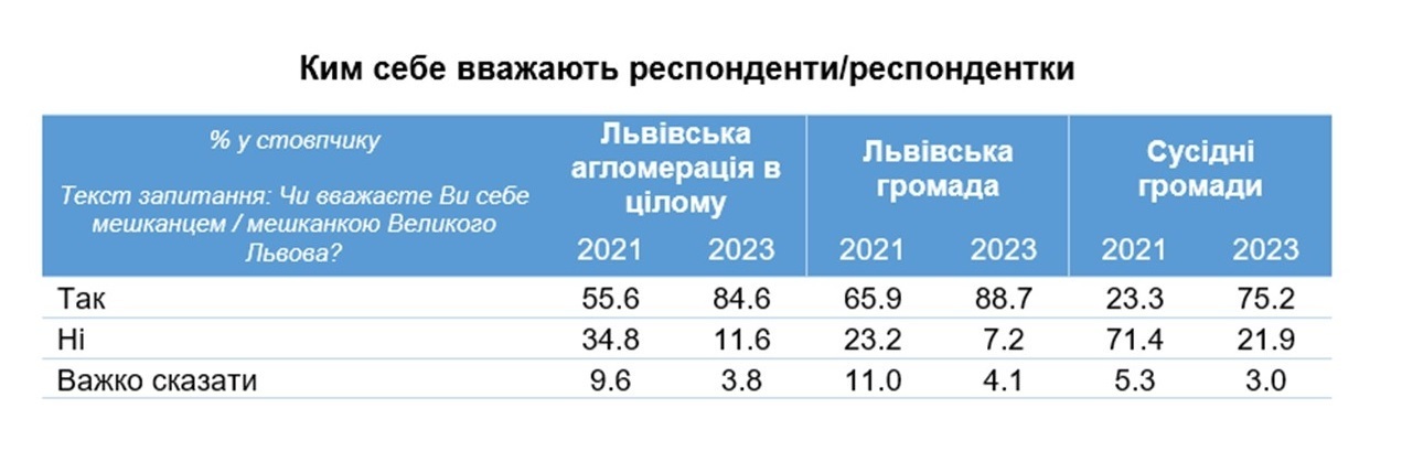 Підсумовуючи ж цей огляд даних соціологічного дослідження, наведемо ще один надзвичайно показовий факт. За період з осені 2021 року з 56% до 85% стало більше тих, хто ідентифікує себе як мешканець чи мешканка Львівської агломерації (Великого Львова). Посилення відбулося і у Львівській громаді (з 66% до 89%), і в сусідніх громадах (з 23% до 75%!). Важливо, що ідентифікація себе з агломерацією (Великим Львовом) серед мешканців і мешканок сусідніх громад слабко залежить від відстані до м. Львова: незалежно від відстані 70-79% вважають себе частиною Великого Львова.