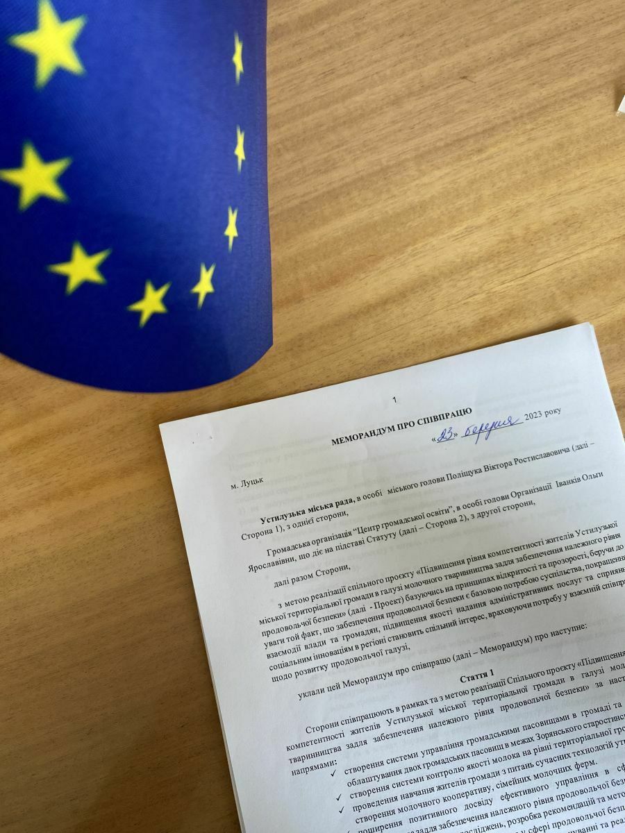 Підписанням Меморандуму між ГО «Центр громадської освіти» та Устилузькою міською громадою на Волині стартував проєкт «Підвищення рівня компетентності жителів Устилузької міської територіальної громади в галузі молочного тваринництва задля забезпечення належного рівня продовольчої безпеки».