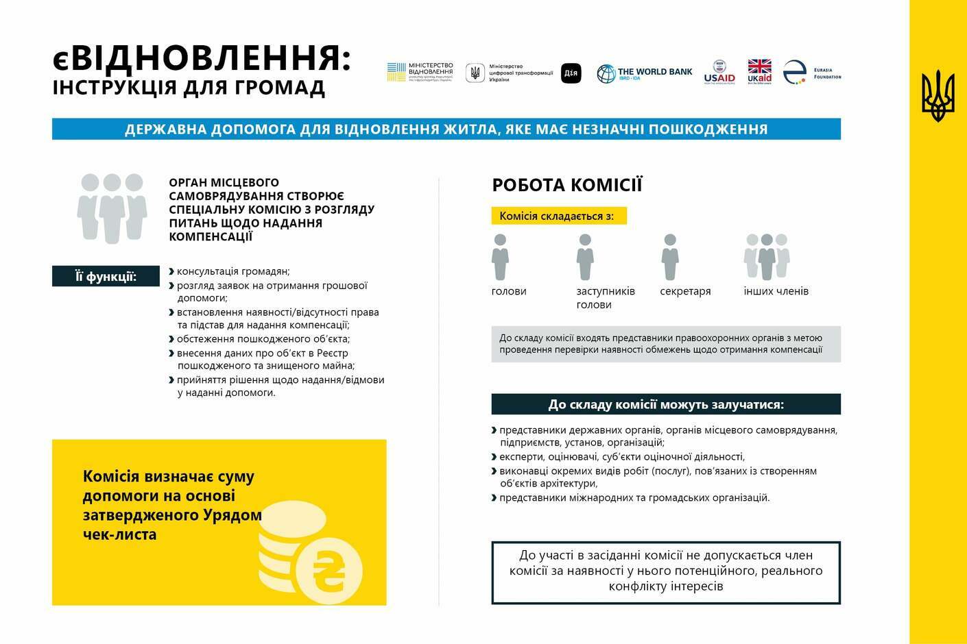 У рамках єВідновлення Міністерство планує сконцентруватися на відновленні житлових будинків, які мають незначні пошкодження. Для того, щоб це можна було зробити якнайшвидше, послугу єВідновлення максимально цифровізували та спростили для громадян. Подати заявку на допомогу можна в Дії в декілька кліків, і вже протягом місяця спеціальна комісія при громаді повинна прийняти рішення щодо надання такої допомоги.