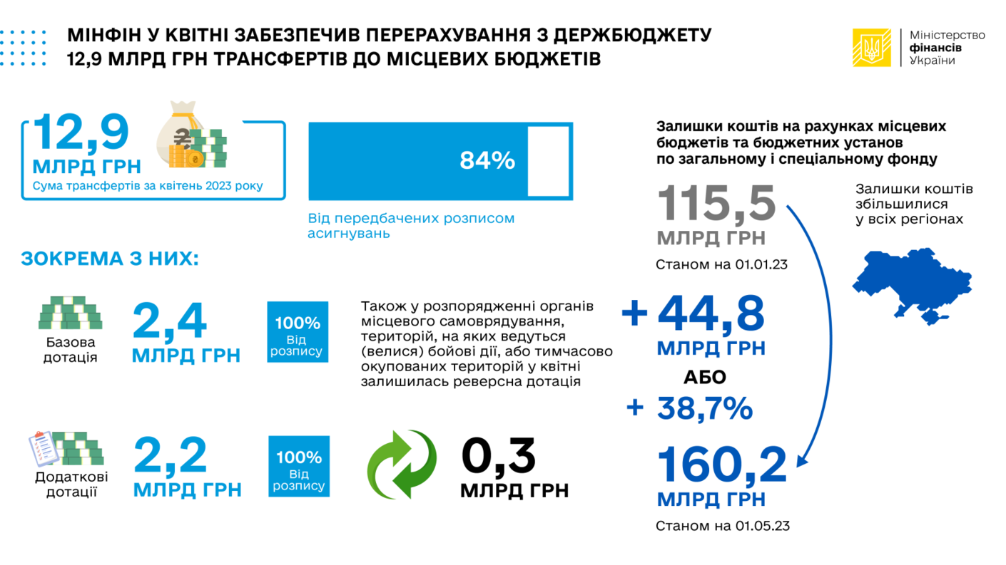 У квітні 2023 року Уряд України забезпечив перерахування міжбюджетних трансфертів місцевим бюджетам в обсязі 12,9 млрд грн, що становить 84% від передбачених розписом асигнувань.