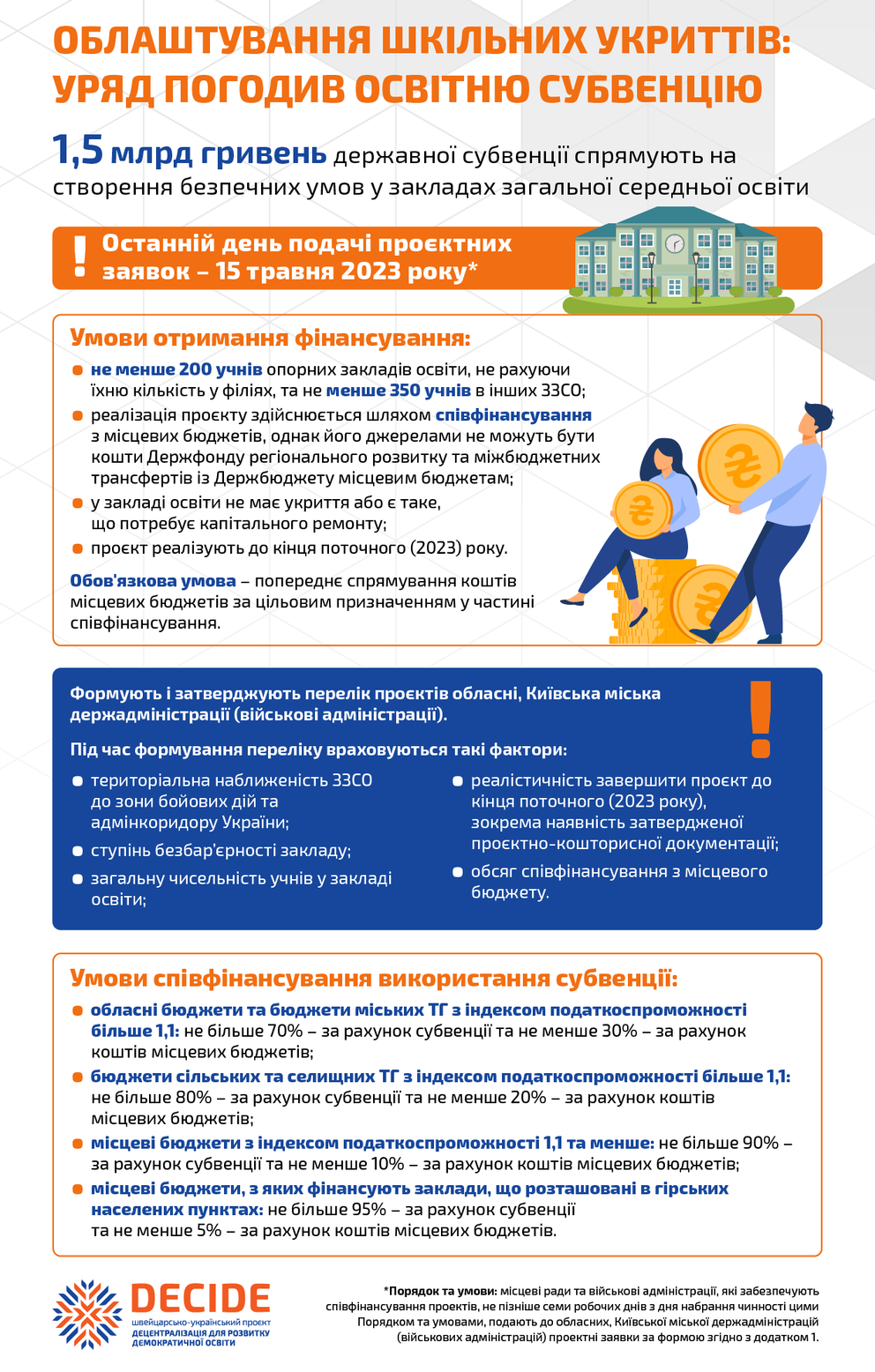 28 квітня 2023 року Кабінет Міністрів України прийняв постанову №419 «Деякі питання надання субвенції з державного бюджету місцевим бюджетам на облаштування безпечних умов у закладах загальної середньої освіти», що регулює правила та порядок отримання коштів для ремонту або ж створення укриттів у закладах освіти.