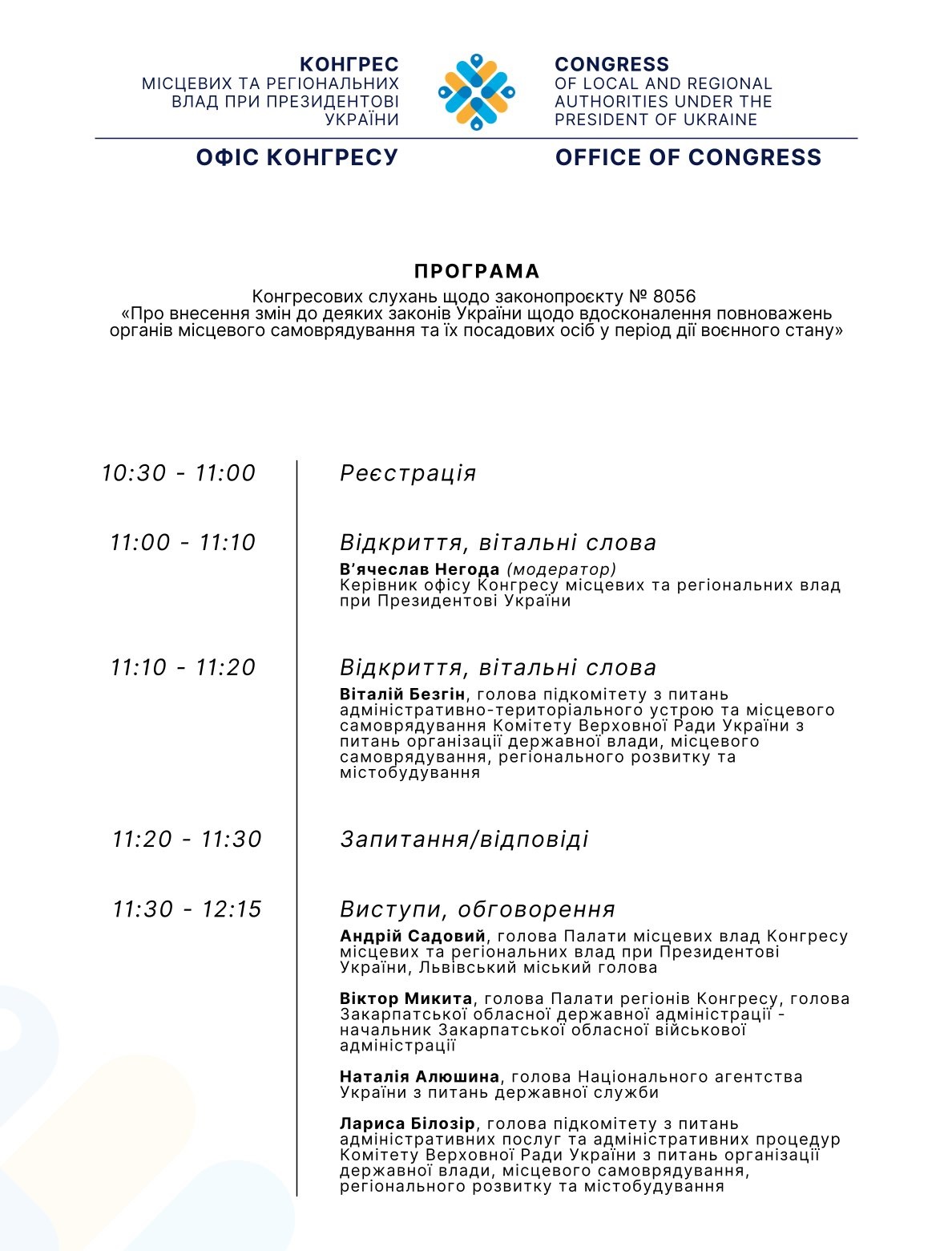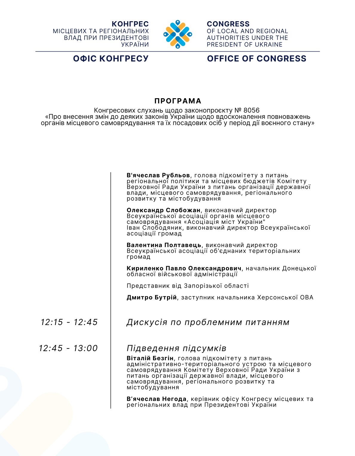 16 травня об 11 год відбудуться Конгресові слухання щодо проєкту Закону «Про внесення змін до деяких законів України щодо вдосконалення повноважень органів місцевого самоврядування та їх посадових осіб у період дії воєнного стану» №8056).