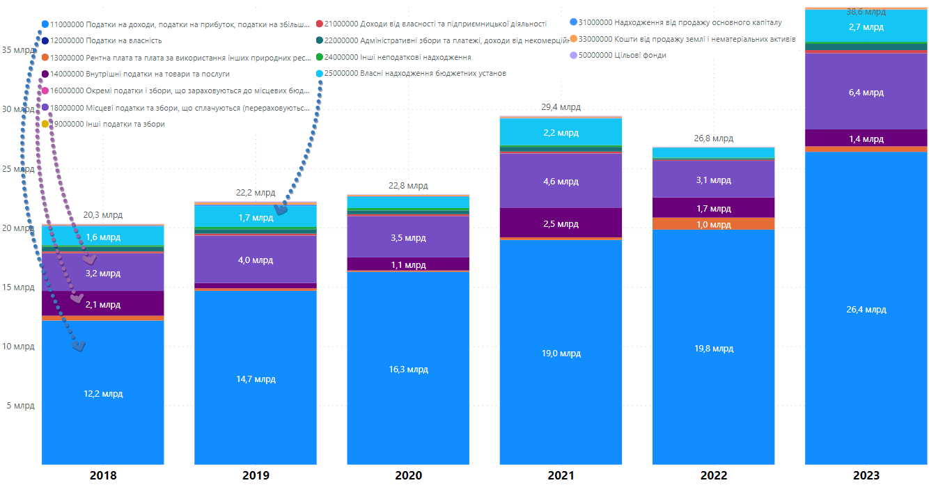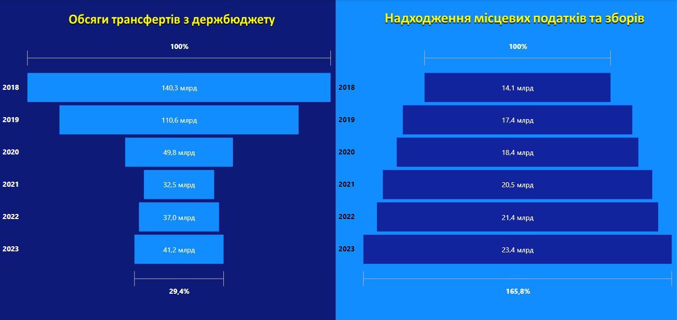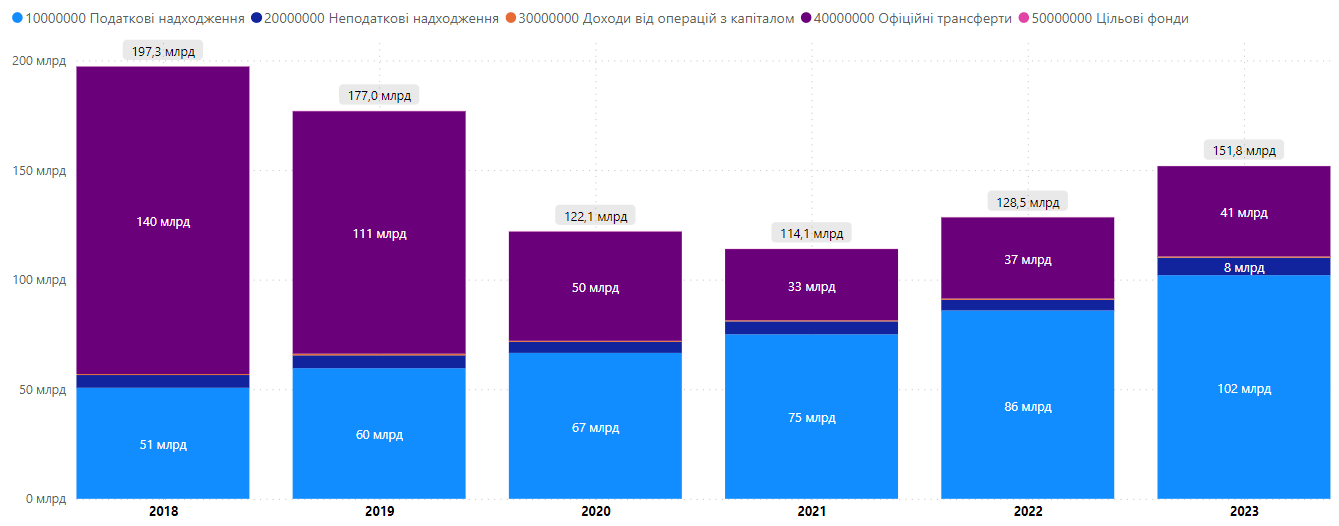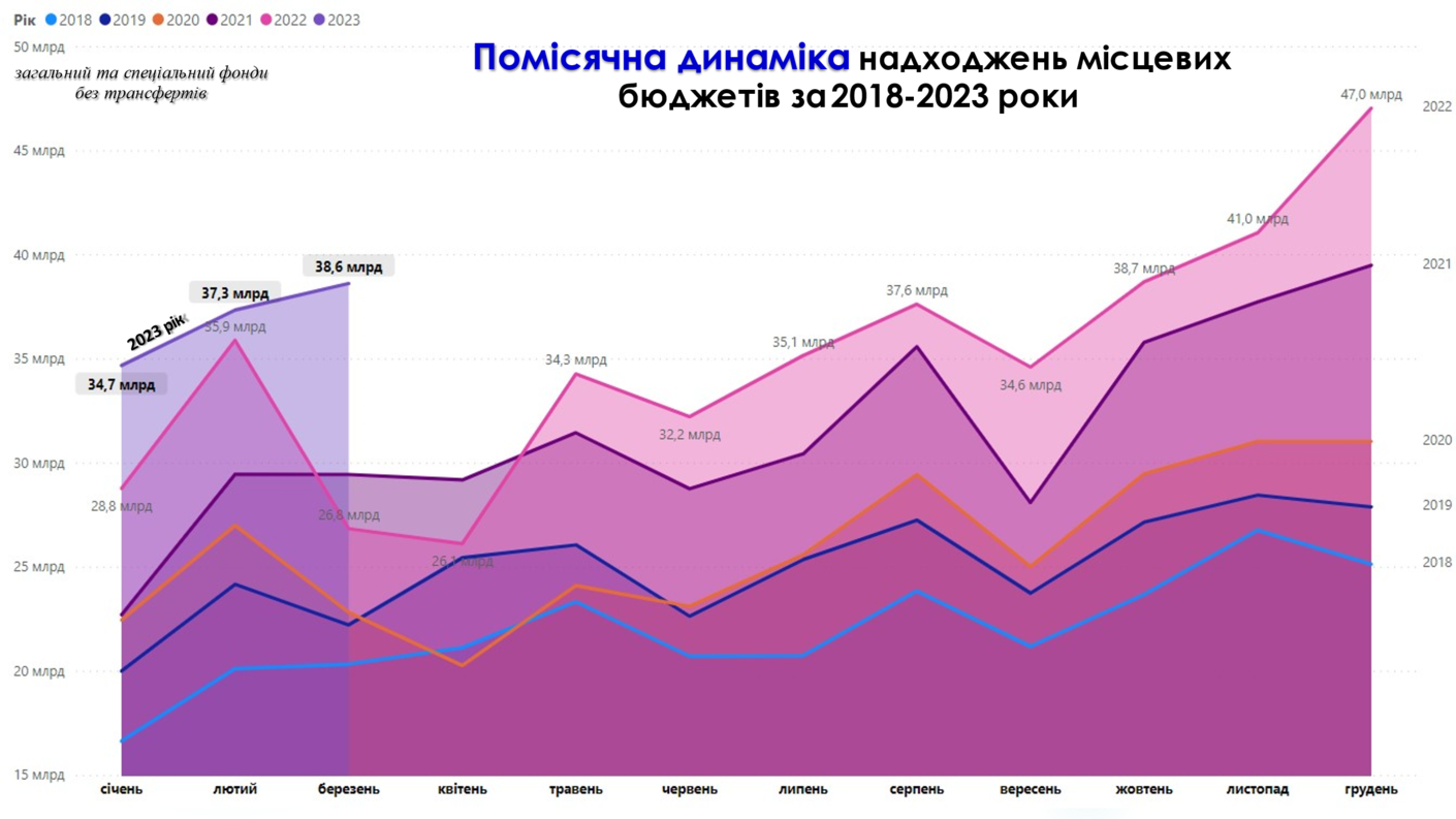 Нижче продемонстровано динаміку всіх видів надходжень до місцевих бюджетів за січень-березень з 2018 по 2023 рік. Очевидно, що в І кварталі 2018 року левову частку займали трансферти (71%), податкові надходження складали 26%. У свою чергу в січні-березні 2023 року податкові надходження складають 67% всіх надходжень до місцевих бюджетів. Помітним є також зростання обсягу трансфертів з 2021 року. Податкові надходження за І квартал 2023 року зросли вдвіччі, в порівнянні з І кварталом 2018 року (з 52 млрд грн до 102 млрд грн).