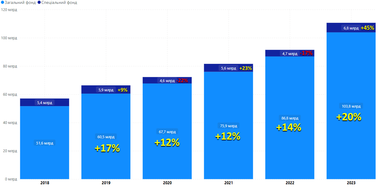 Розглядаючи обсяги надходжень загального та спеціального фондів місцевих бюджетів за січень-березень 2018-2023 років, помітними є зниження доходів спеціального фонду місцевих бюджетів у 2020 році (пандемія) та 2022 році (початок повномасштабного вторгнення рф). При цьому, надходження загального фонду завжди знаходились в додатному прирості. А в І кварталі 2023 року сягнули +20% або +17 млрд грн. У свою чергу, доходи спеціального фонду в І кварталі 2022 року зменшились на 17% або -0,9 млрд грн, а в січні-березні 2023 року показали ріст +45% або +2,1 млрд грн, порівняно із січнем-березнем 2022 року.