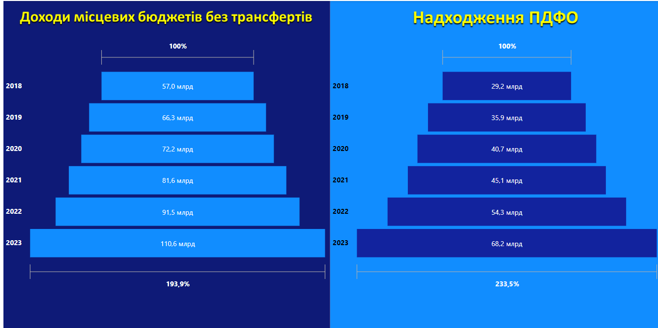 Аналізуючи окремі доходи місцевих бюджетів за І квартал 2018-2023 років, починаючи із 2018 року, помітним є значний приріст ПДФО (більш ніж вдвічі), що зумовлено закріпленням за бюджетами місцевого самоврядування додаткових 4% ПДФО з 2022 року, зростанням грошових винагород та інших виплат, одержаних військовослужбовцями та особами рядового і начальницького складу, а також інфляцією. Загалом власні доходи місцевих бюджетів з 2018 року також зросли майже вдвічі, без урахування інфляції з 57,0 млрд грн до 110,6 млрд грн; з урахуванням інфляційних процесів ріст склав +55% або +31,1 млрд грн. Ріст власних доходів у І кварталі 2023 року, порівняно із І кварталом 2022 року, з урахуванням інфляції, склав +12% або +11,1 млрд грн.