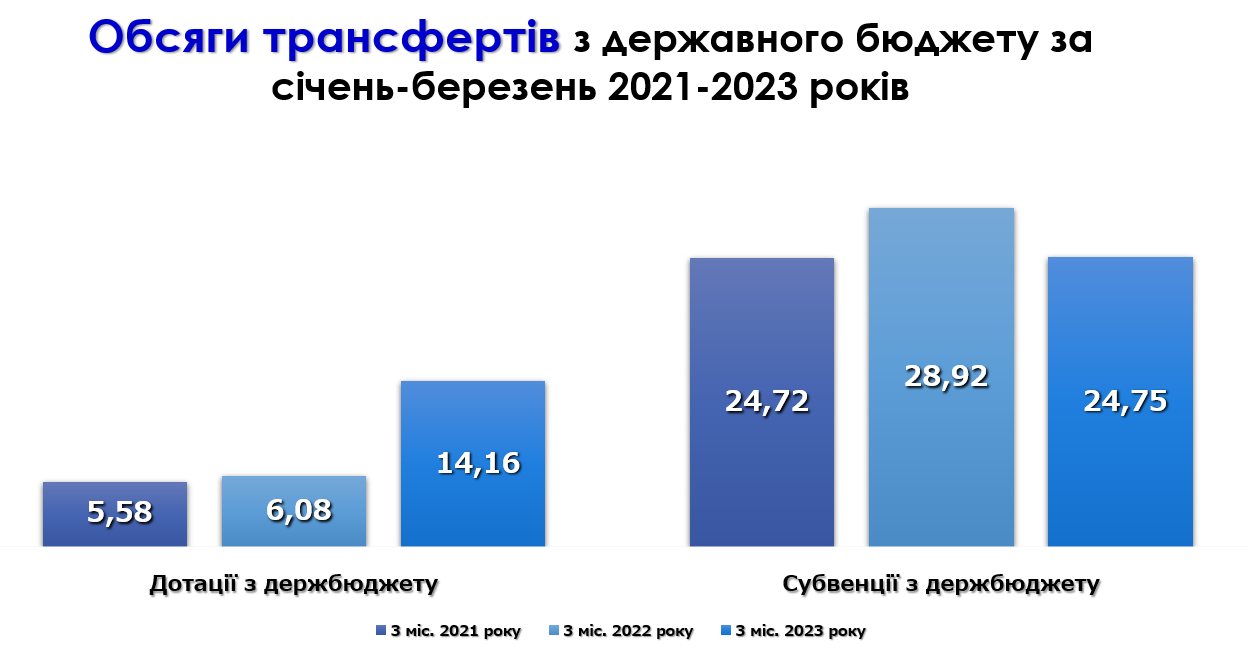 Але, при цьому, якщо порівнювати січень-березень 2021-2023 років, помітним є зростання обсягів дотацій і зменшення обсягів субвенцій, що зумовлене викликами війни, зокрема передбачення на 2023 рік додаткової дотації для територій, які постраждали від російської агресії та інших територій в обсязі 23,9 млрд грн.