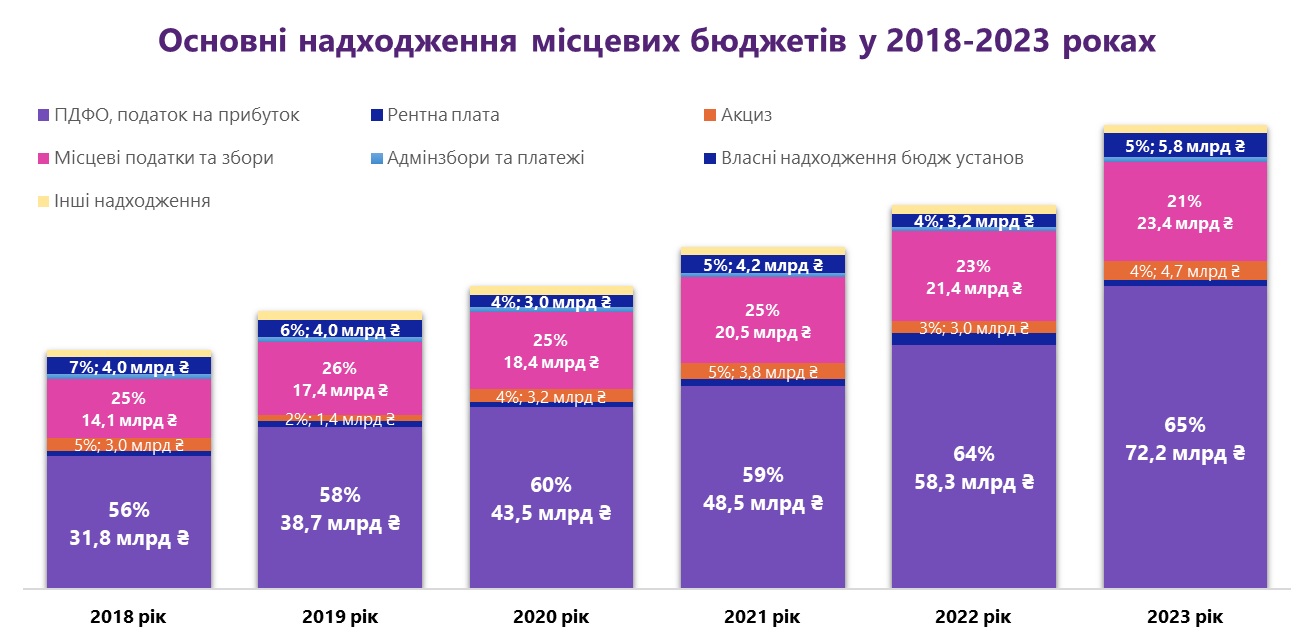 Основну частку власних доходів місцевих бюджетів у січні-березні 2023 року складають податки на доходи, на прибуток (ПДФО та податок на прибуток) – 65%. Ця частка зросла на 9%, починаючи з 2018 року. Наступними за обсягом є місцеві податки та збори 21%, але варто відзначити, що їхня частка з 2018 року знизилась на 4%. Помітними є також коливання надходжень акцизу. Значними за обсягами є також власні надходження бюджетних установ, які в основному використовуються для покриття витрат, пов'язаних з організацією та наданням послуг, що надаються бюджетними установами згідно з їх основною діяльністю.