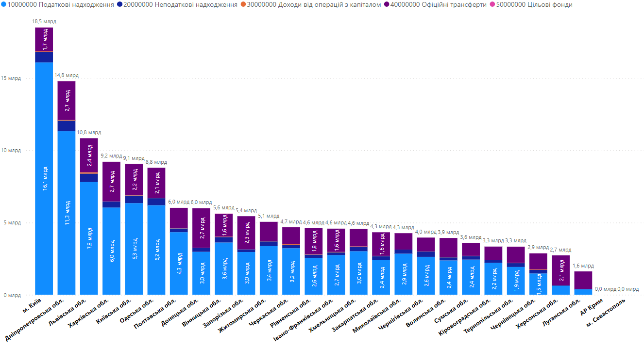 У регіональному розрізі надходжень у січні-березні 2023 року очевидними є значні обсяги доходів бюджету міста Києва та місцевих бюджетів Дніпропетровської області. Для прикладу, обсяги надходжень бюджету міста Києва у 6 разів перевищують обсяги надходжень всіх місцевих бюджетів Чернівецької області, та у 5,6 раз – всіх місцевих бюджетів Тернопільської області. При цьому, обсяги трансфертів до міста Києва є незначними, порівняно з іншими регіонами. Найбільше трансфертів за січень-березень 2023 року отримали Донецька, Харківська, Дніпропетровська, Львівська та Запорізька області (більше 2,3 млрд грн). Найбільший відносний приріст, порівняно із січнем-березнем 2022 року, у Херсонській області (+94% або +1,0 млрд грн). При цьому помітно, що податкові надходження Херсонської області знаходяться на наднизькому рівні.