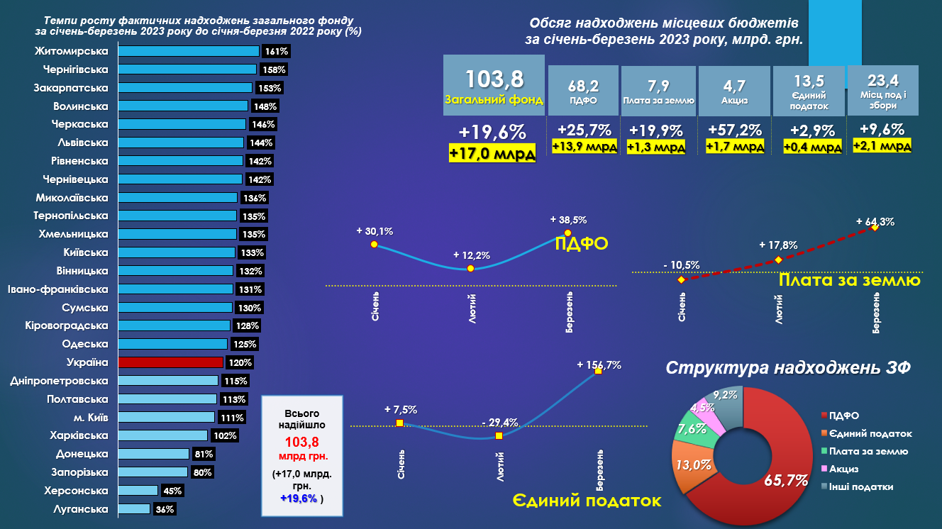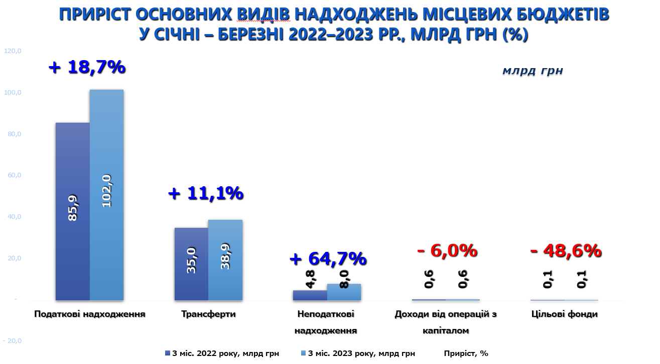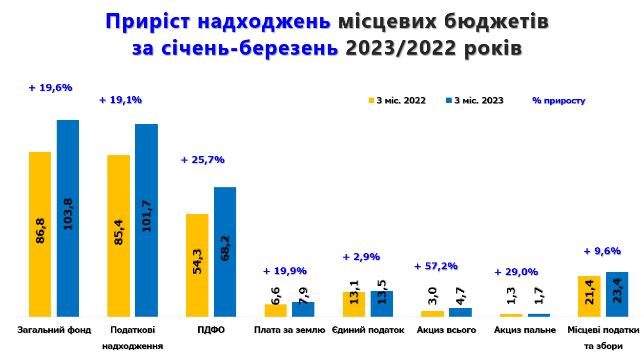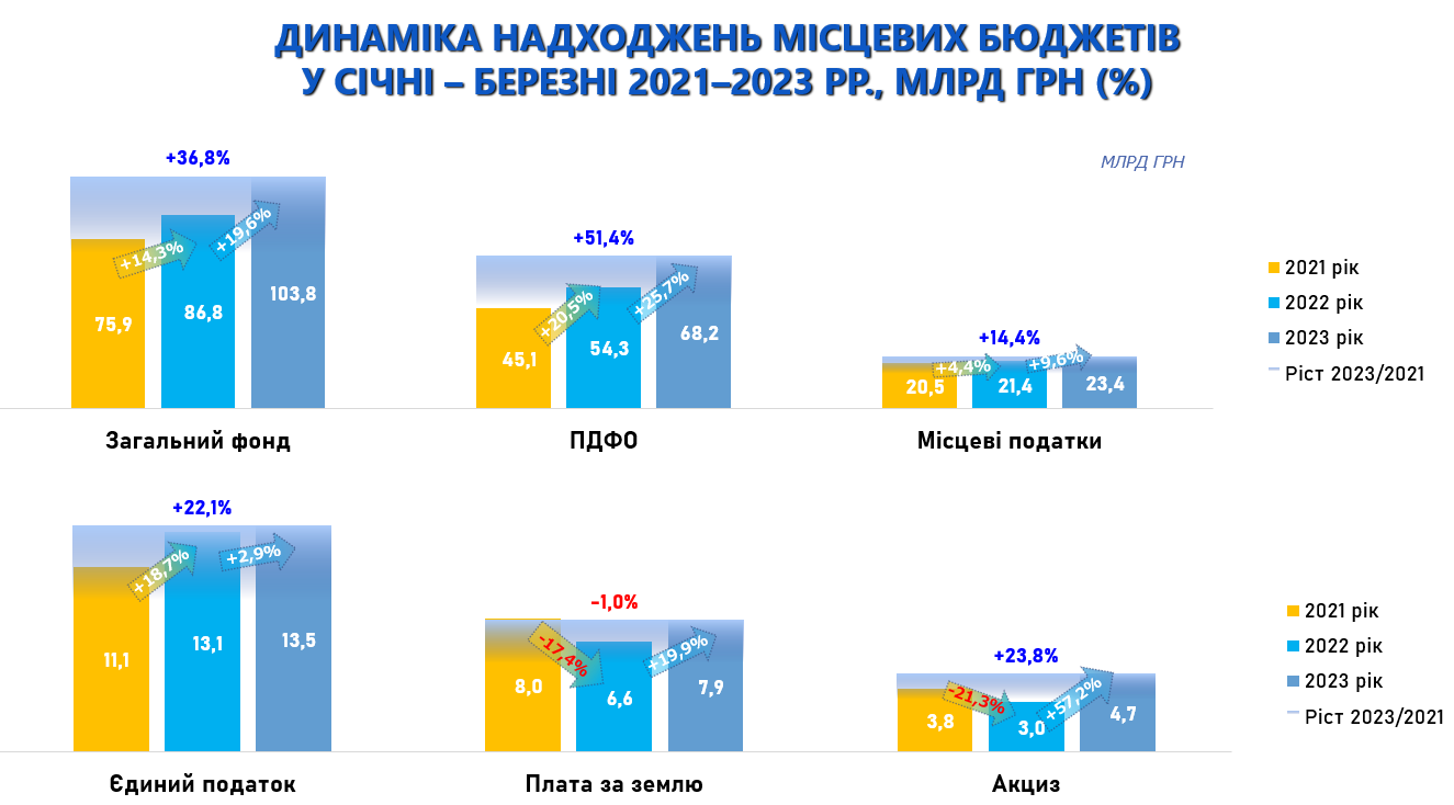 Загалом за січень-березень 2023 року до загального фонду місцевих бюджетів (без урахування міжбюджетних трансфертів) надійшло 103,8 млрд грн, що становить +19,6% або +17,0 млрд грн приросту проти січня-березня 2022 року. Це в основному зумовлено значним ростом податку з доходів фізичних осіб (+25,8% або +13,9 млрд грн).