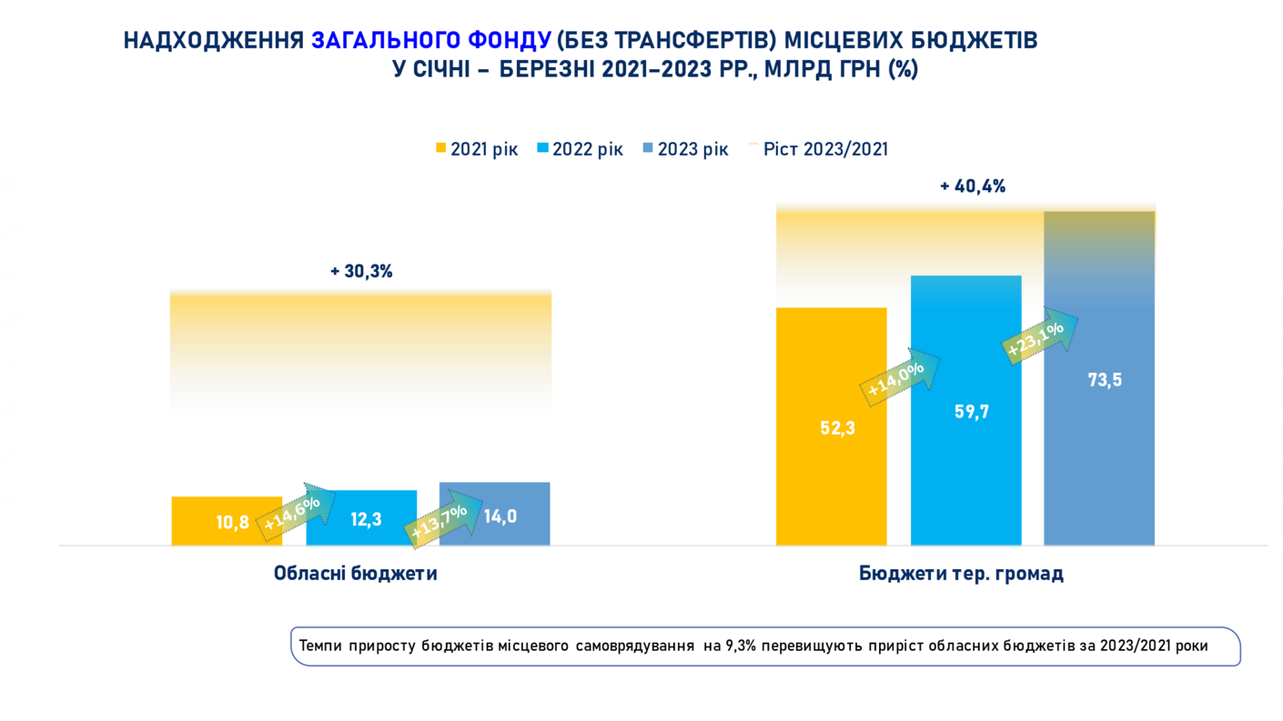 Помітною також є значна різниця в обсягах доходів бюджетів територіальних громад та обласних бюджетів. Так за січень-березень 2023 року до загального фонду (без трансфертів) бюджетів територіальних громад надійшло в 5,4 рази більше доходів, ніж до обласних бюджетів (73,5 млрд грн та 14,0 млрд грн відповідно).