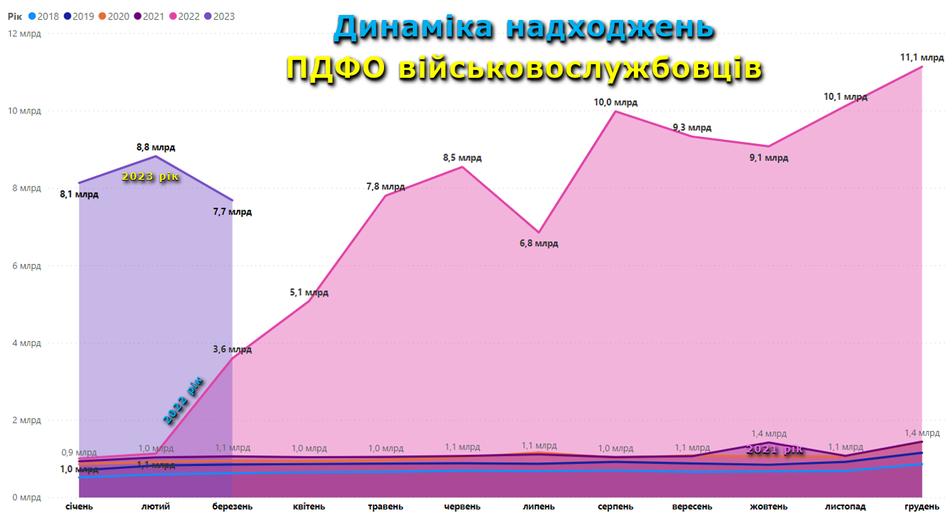 Високий приріст ПФДО забезпечили надходження від грошового забезпечення, грошових винагород та інших виплат, одержаних військовослужбовцями та особами рядового і начальницького складу. Так, за січень-березень 2023 року місцеві бюджети отримали 24,6 млрд грнтаких доходів, що на 329% більше, ніж у 2022 році (+18,9 млрд грн). В середньому 8,2 млрд грн на місяць.