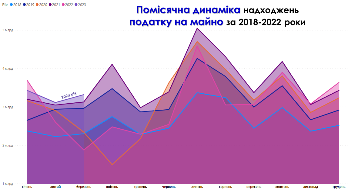 Спостерігається також відновлення надходжень податку на майно. Так за січень-березень 2023 року його надійшло 9,9 млрд грн. Помітним є значне зниження таких надходжень у 2022 році внаслідок запровадження податкових пільг на сплату плати за землю та податку на нерухоме майно. Так, у березні 2022 року надійшло лише 1,9 млрд грн цього податку, в той час коли в березні 2023 році вже надійшло 3,3 млрд грн. Найбільшу частку цього податку склала орендна плата з юридичних осіб (1,8 млрд грн у березні 2023 року).