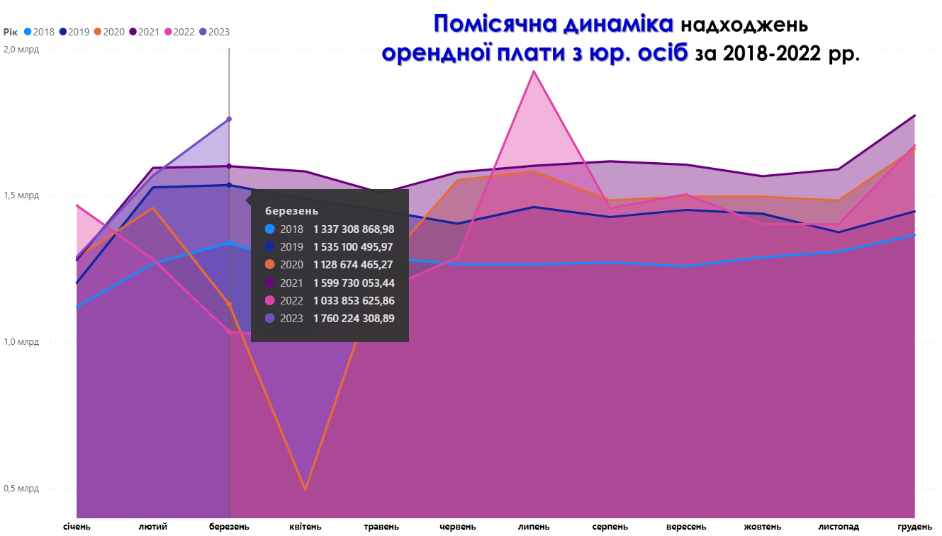 Зросли також і надходження ключового елементу податку на майно орендної плати з юридичних осіб (46,8% за І кв. 2023 року). У березні 2023 року вони досягли 1,8 млрд грн. Загалом приріст до січня-березня 2022 року складає +235%.