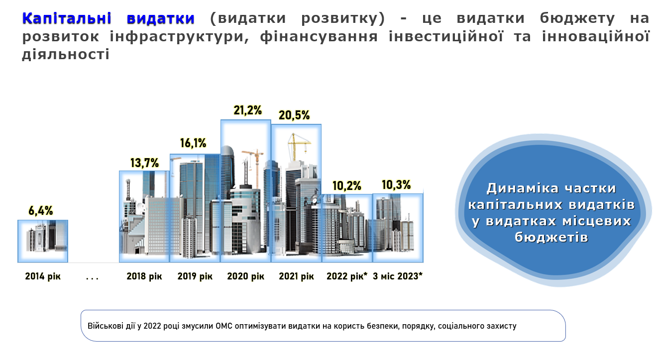 Варто також звернути увагу на частку капітальних видатків у структурі всіх видатків місцевих бюджетів. Очевидними є результати децентралізаційної реформи. Адже зазначений показник у 2014 році складав лише 6,4%, що не давало змоги належно розбудовувати власну інфраструктуру громад. Натомість вже у 2020 році цей показник сягнув рекордних 21,2%.