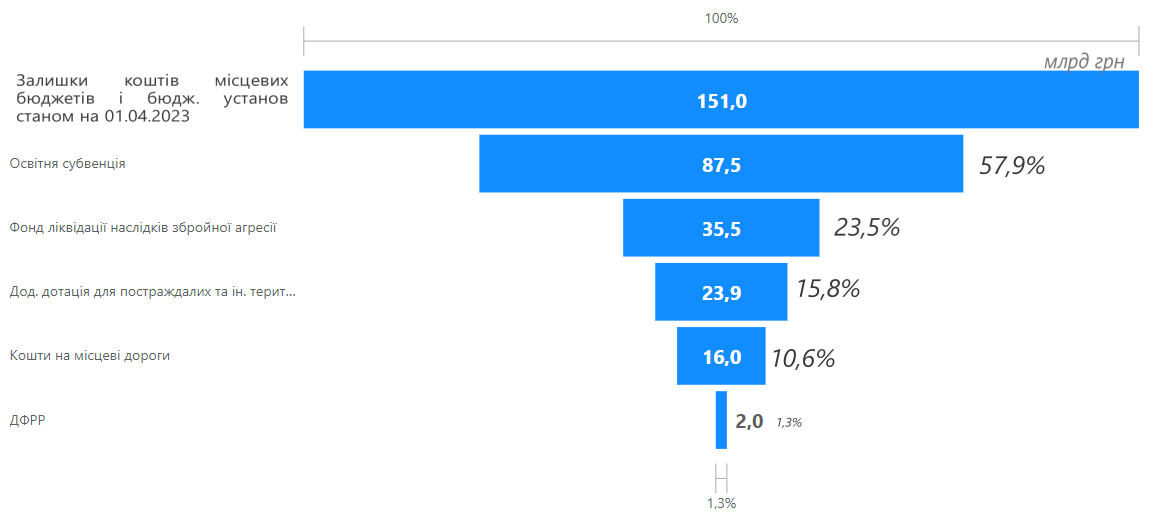 Слід зауважити, що левову частку займають саме залишки коштів місцевих бюджетів – 138,0 млрд грн (91%), залишки коштів на рахунках бюджетних установ складають 13,0 млрд грн (9%).