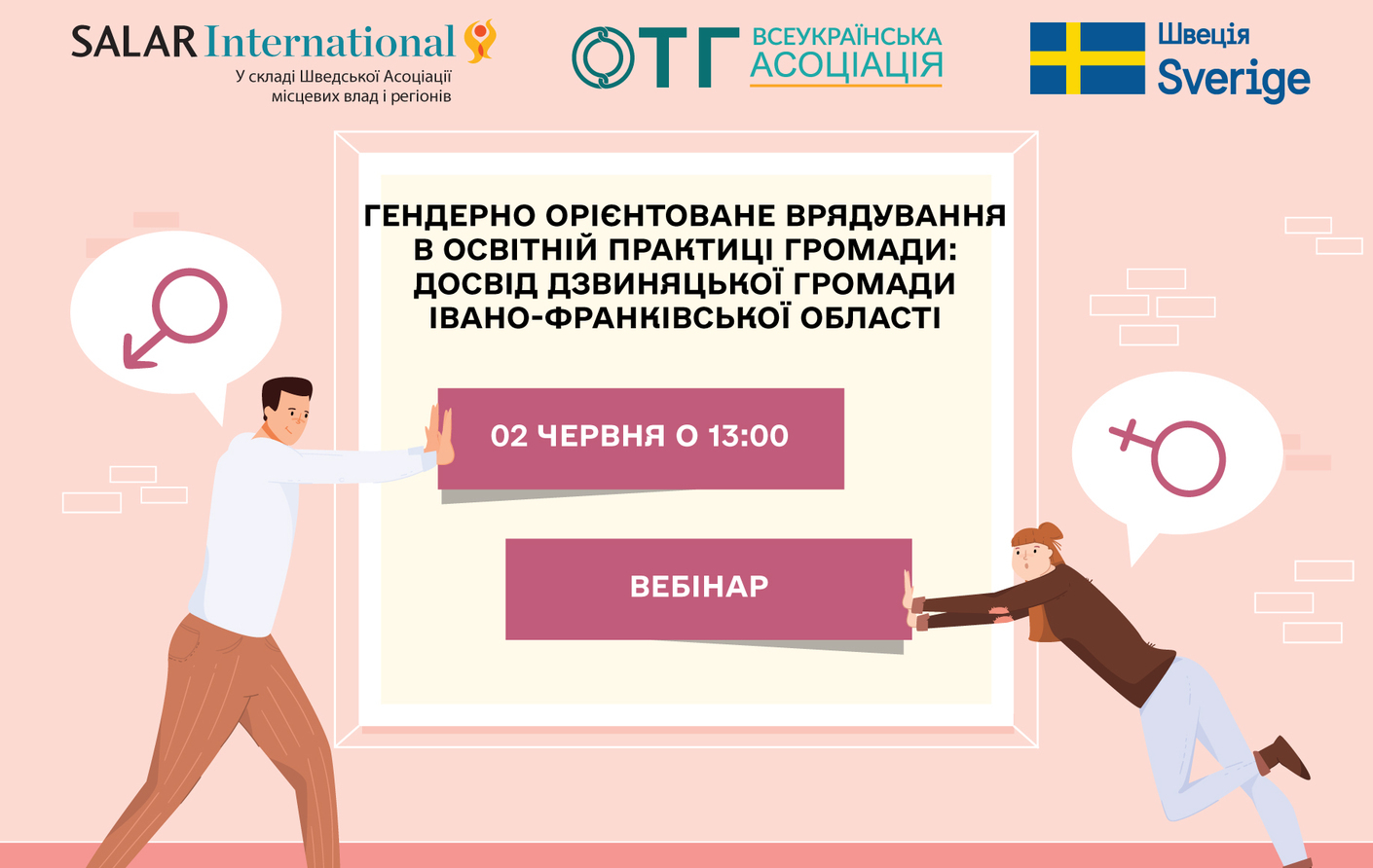 02 червня 2023 року о 13:00 Шведсько-український проєкт «Підтримка децентралізації в Україні» (SALAR International) спільно з Всеукраїнською Асоціацією ОТГ проведуть вебінар на тему: «Гендерно орієнтоване врядування в освітній практиці громади: досвід Дзвиняцької громади Івано-Франківської області».