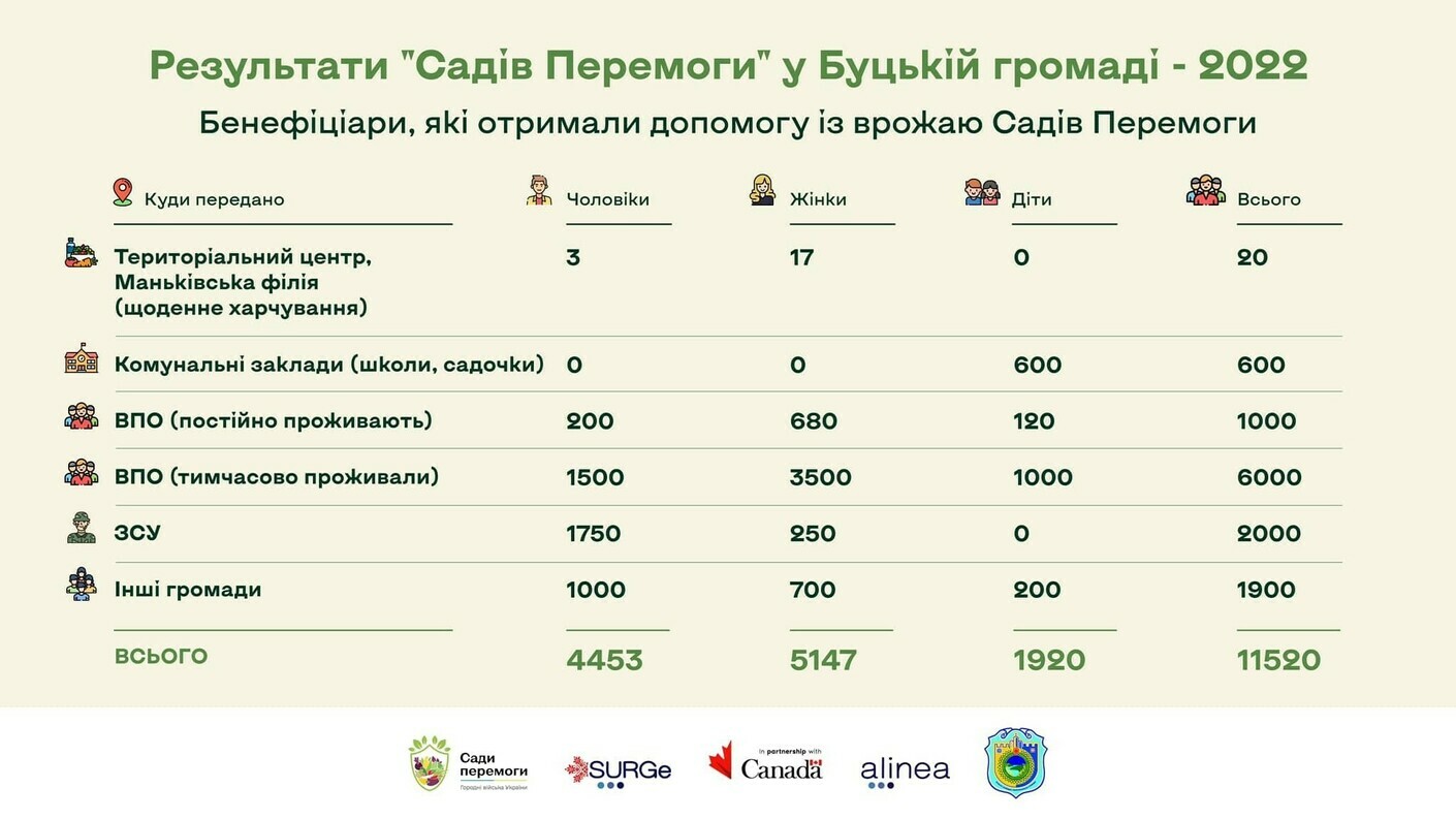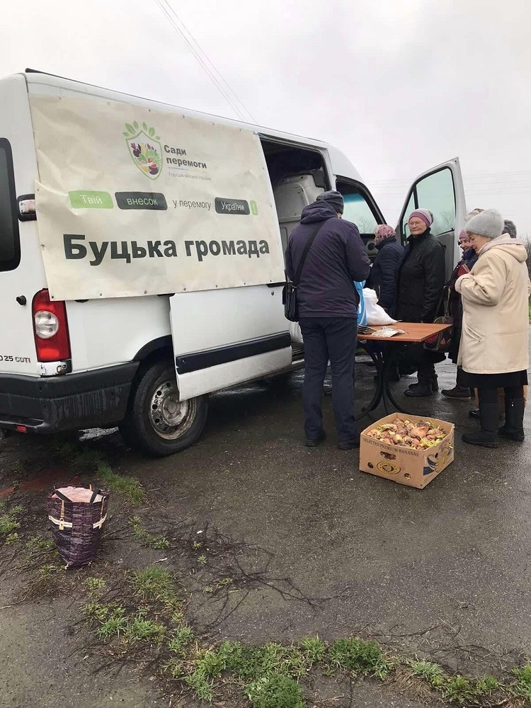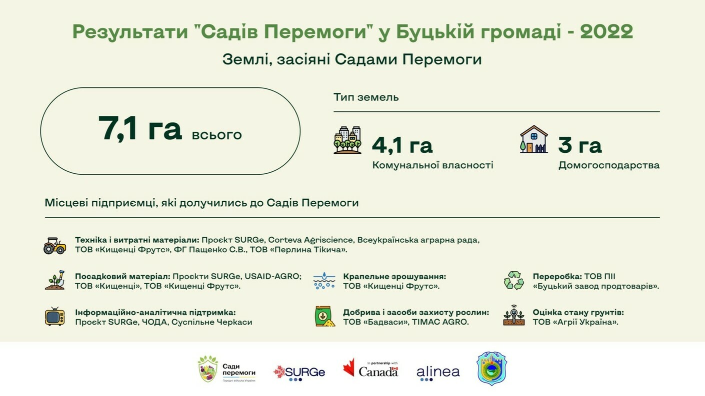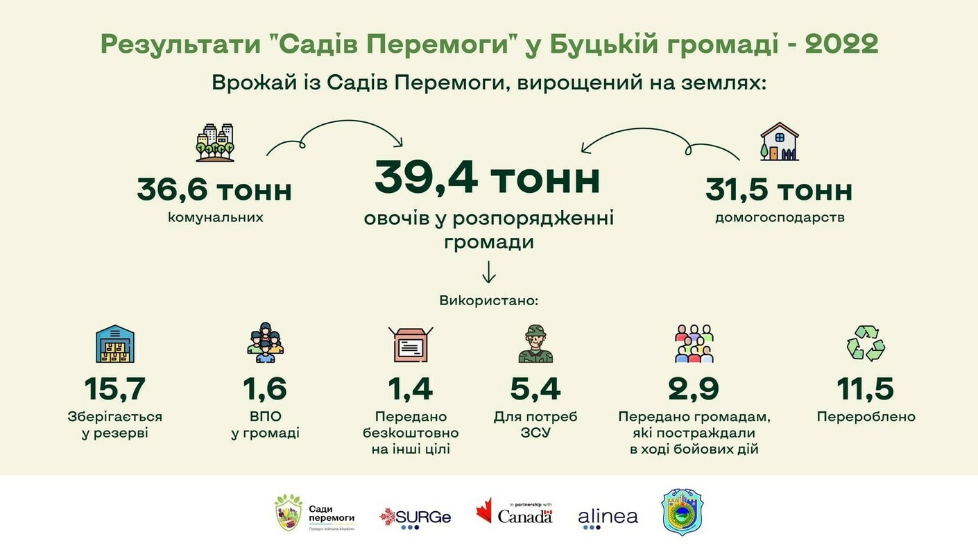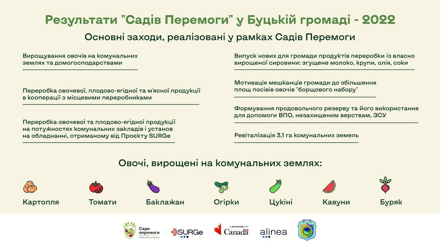 Буцька територіальна громада на Черкащині однією з перших долучилася до Садів Перемоги: за підтримки експертів ініціативи розробила та затвердила «Програму підтримки самозабезпечення Буцької територіальної громади харчовими продуктами на 2022-2024 роки «Сади Перемоги»[1] (Програма з продовольчої безпеки). Орієнтуючись на свої потреби, громада визначила основне завдання: забезпечити ВПО, вразливі групи населення, ЗСУ та громади, які найбільше постраждали від війни, харчовими продуктами, вирощеними та законсервованими силами громади.