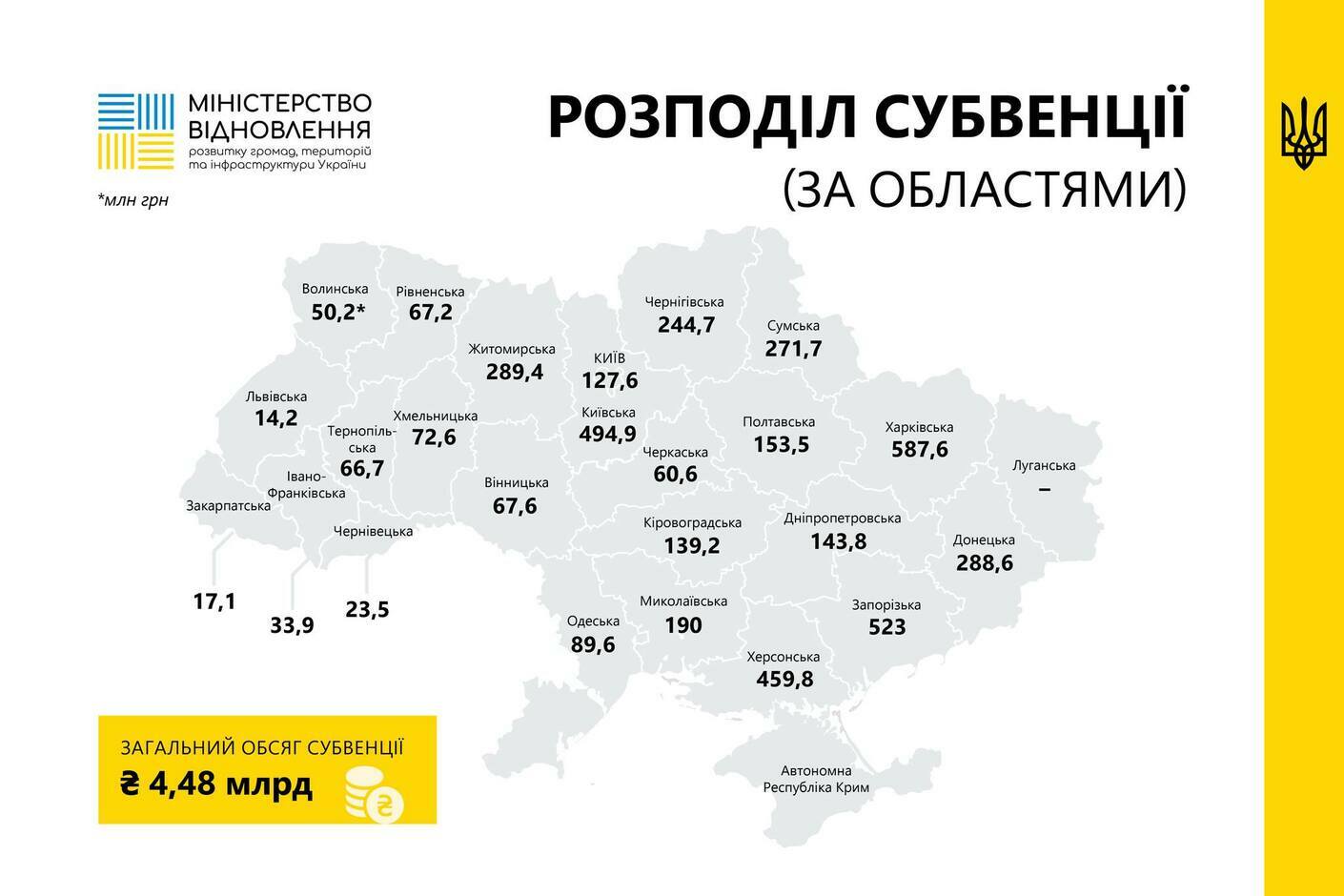 Кабінет Міністрів України затвердив Порядок та умови розподілу майже 4,48 мільярда гривень субвенції місцевим бюджетам на відновлення та розвиток інфраструктури, зокрема шкіл, лікарень, житла, об’єктів ЖКГ тощо.