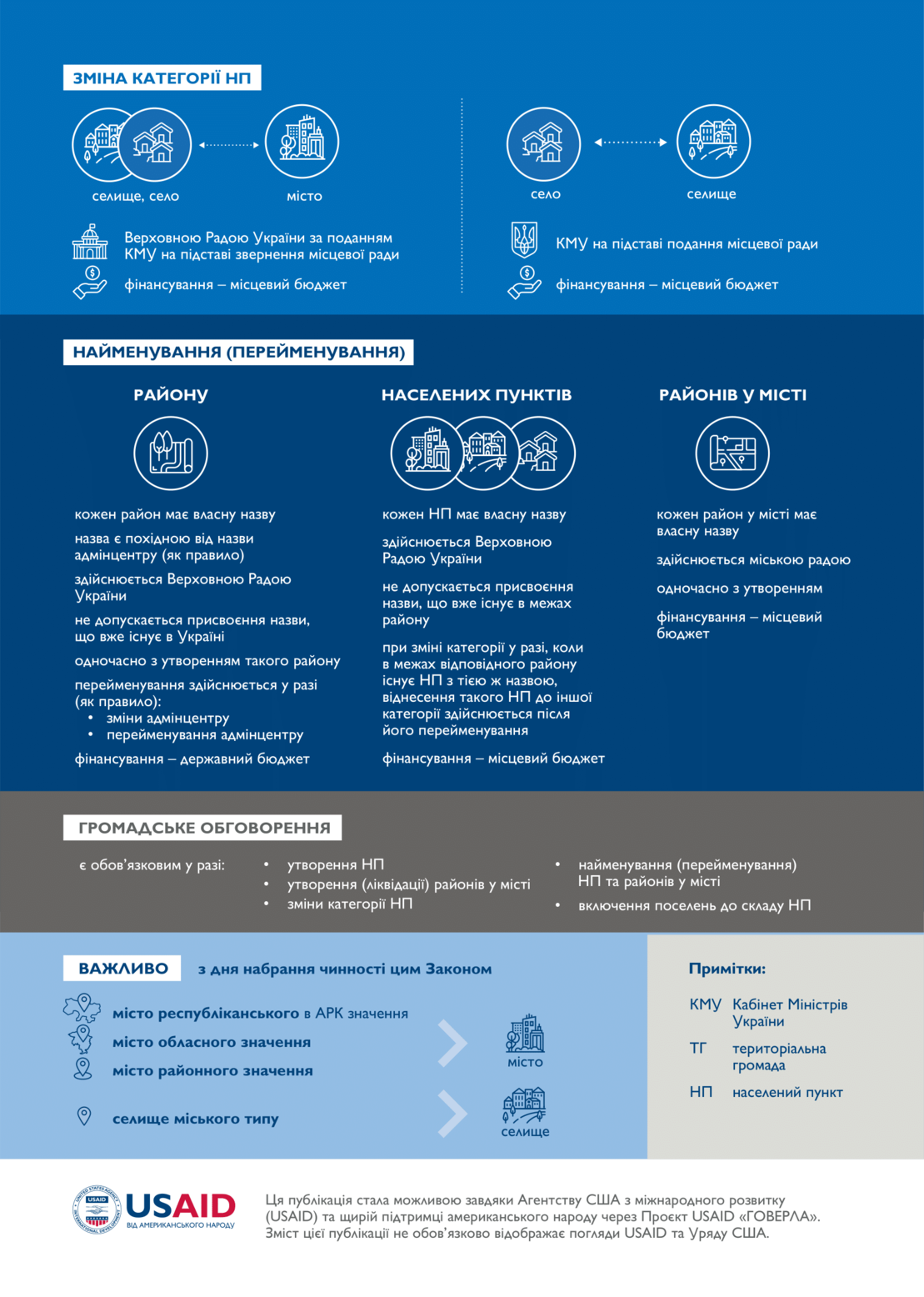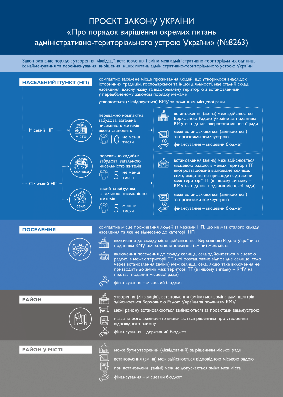 Як повідомлялося, законопроект пропонує нарешті прибрати чинне з 1981 року радянське регулювання питань адмінтерустрою, встановити чіткі процедури віднесення населених пунктів до категорії міст, селищ сіл, закріпити на рівні закону процедуру найменування та перейменування населених пунктів, спростити процедури встановлення меж населених пунктів тощо.