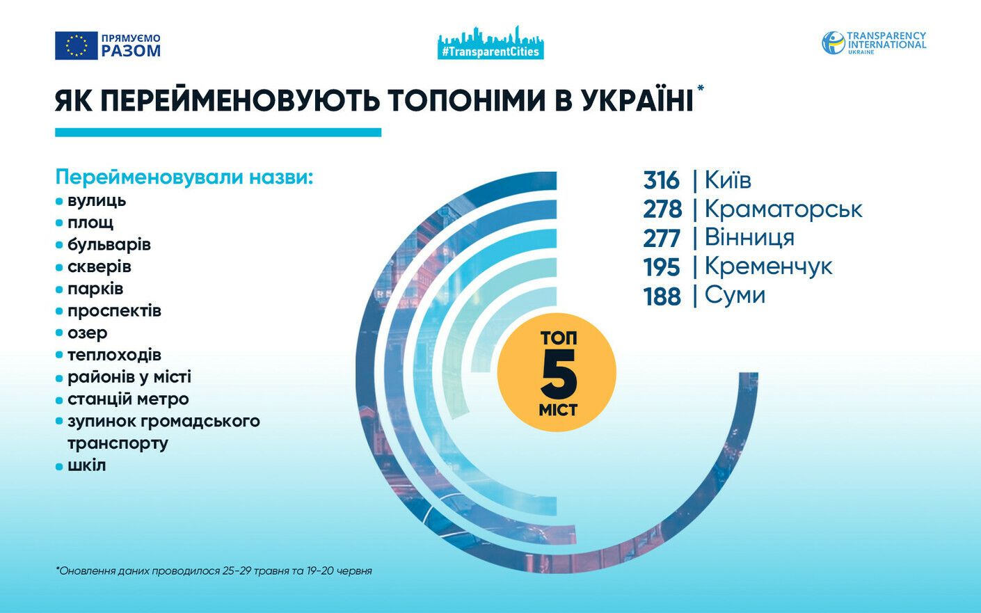 Так, протягом 2022–2023 років 42 міські ради з 50 досліджуваних програмою «Прозорі міста» перейменували 3225 топонімів. Найбільше проявів деколонізації показують Київ, Краматорськ, Вінниця, Кременчук та Суми. У Вінницькій та Мукачівській міських радах вже заявили про завершення деколонізації топонімів, а в Коломийській збирають пропозиції мешканців щодо назв, які не мають інформативної, історичної чи меморіальної цінності.
