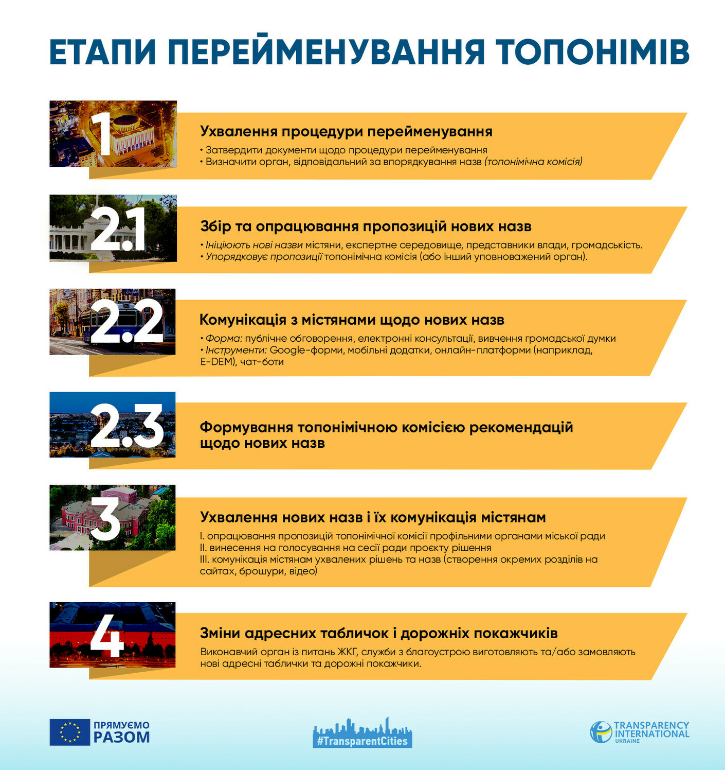 Після опрацювання пропозицій на сесію ради виноситься проєкт рішення про перейменування топонімів. Якщо його підтримають — нові назви потрібно належним чином прокомунікувати громадськості.