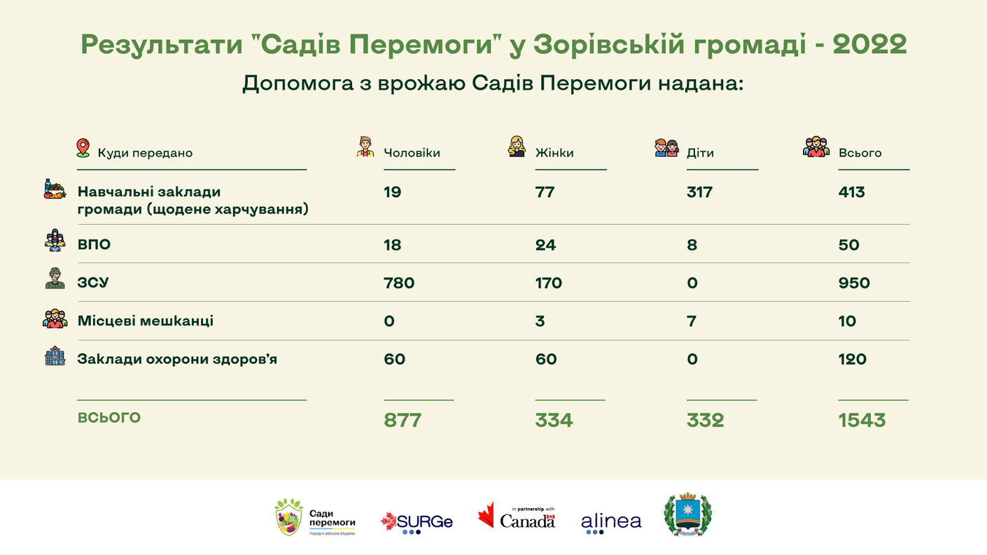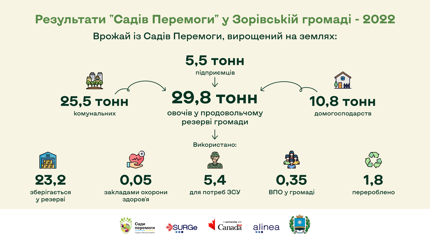 Допомогти Зорівці взялася ініціатива Сади Перемоги проєкту SURGe, що фінансується Урядом Канади. Пані Галина не втрачала часу та одразу зібрала спільну робочу групу, де разом з експертами Садів громада розробила та затвердила програму підтримки самозабезпечення харчовими продуктами та покроковий план її виконання. Серед пріоритетів, визначених в програмі, - збільшити площі посіву для вирощування, розвивати харчове перероблення для потреб малозабезпечених жителів, ВПО та збройних сил, а також сформувати потужний продовольчий резерв.