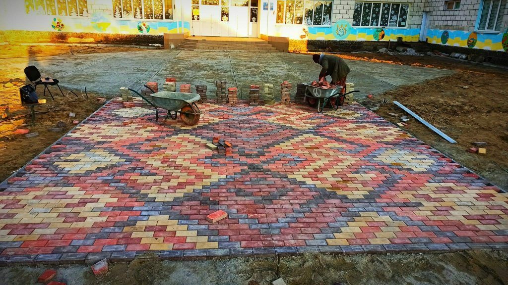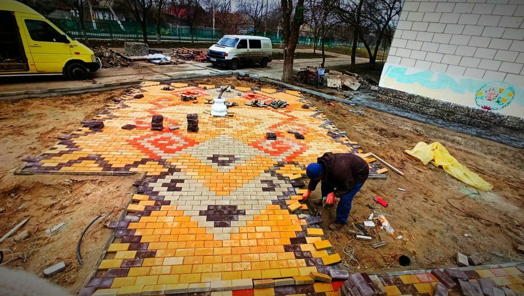 “Дуже важлива частина реалізації цього проєкту – створення самого майданчика. За задумом, плитку треба було викласти так, аби вона повторювала орнамент вишиванки. Це дуже було складно, тому що ніхто ще таке не робив. Учителька молодших класів щодня була присутня і разом із проєктною командою і виконавцями робіт у ручному режимі викладали плитку по сантиметру. Усі горіли цим”, – розповідає Сергій Мергут.