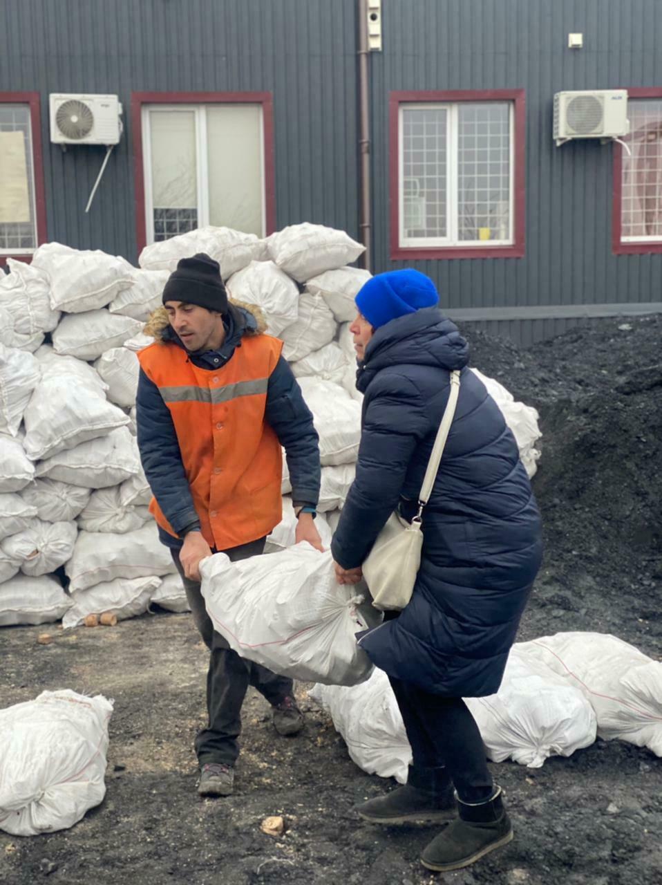 Комунальник Бахмутської міської ради допомагає місцевій мешканці донести паливні брикети на пункті видачі гуманітарної допомоги