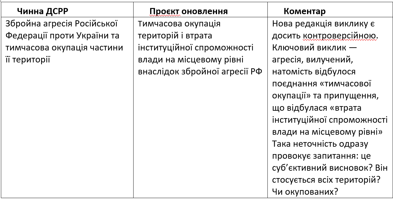 У проєкті Стратегії, яку підготувало профільне Міністерство розвитку громад, територій та інфрастуктури, записано: «Було визначено вісім актуальних викликів розвитку країни, що потребують вирішення, в тому числі, в рамках державної регіональної політики до закінчення планового періоду». На наш погляд, при ідентифікації викликів припустилися певної методологічної помилки: формулювати нові виклики й ігнорувати інші, які були визначені до війни та залишаються актуальними й сьогодні. Війна просто посилила деякі з них. Тому зрозуміти логіку заміни чітко зрозумілих викликів на контроверсійні досить складно.
