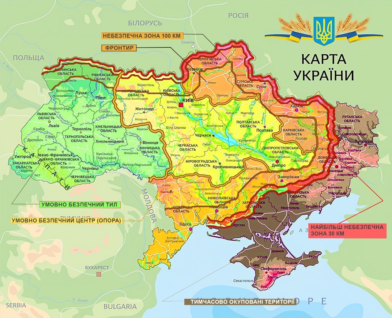 Частина території України в межах 30 км уздовж лінії фронту й україно-російського/білоруського кордону є найбільш небезпечною для проживання та ведення економічної діяльності, в межах 100 км — небезпечною.