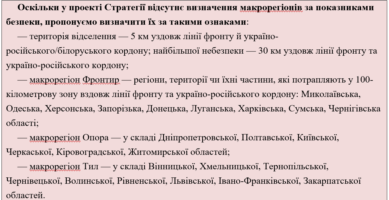 Проте, незважаючи на заявлений у проєкті Стратегії територіальний підхід, у тексті документа так і не зафіксовано, що в Україні реально склалася ситуація із новим макрорегіональним поділом за таким важливим параметром, як безпека.