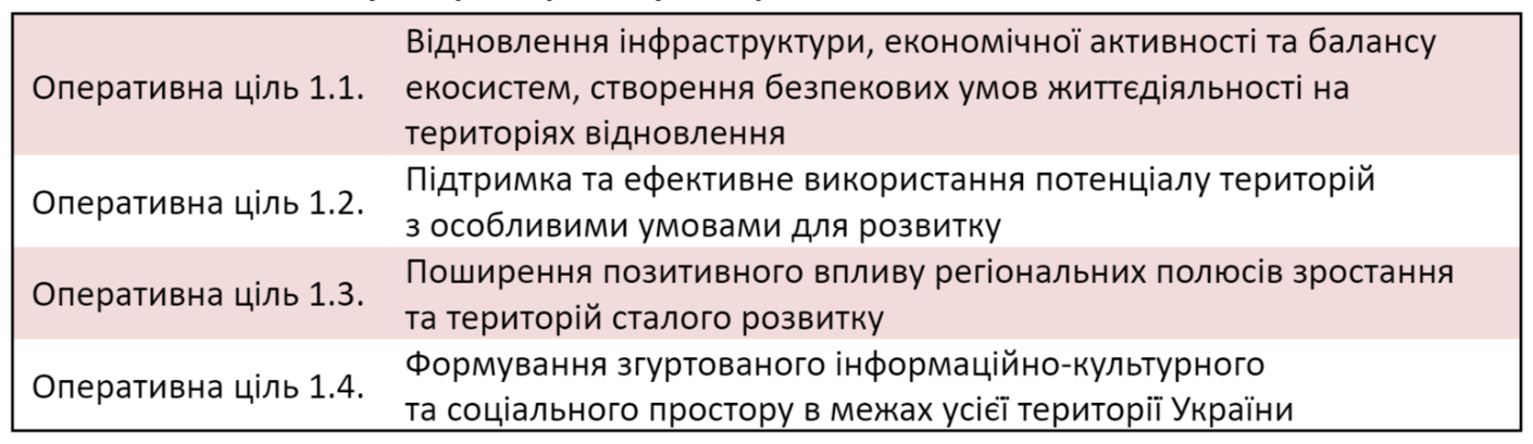 Тому, коли ми беремо формулювання стратегічної цілі 1: «Формування згуртованої держави у соціальному, гуманітарному, економічному, кліматичному, екологічному, безпековому та просторовому вимірах», то ми розуміємо, що оперативні цілі якраз спрямовуються на те, як досягається згуртованість у просторовому чи безпековому вимірі. На жаль, у проєкті Стратегії така чіткість відсутня.