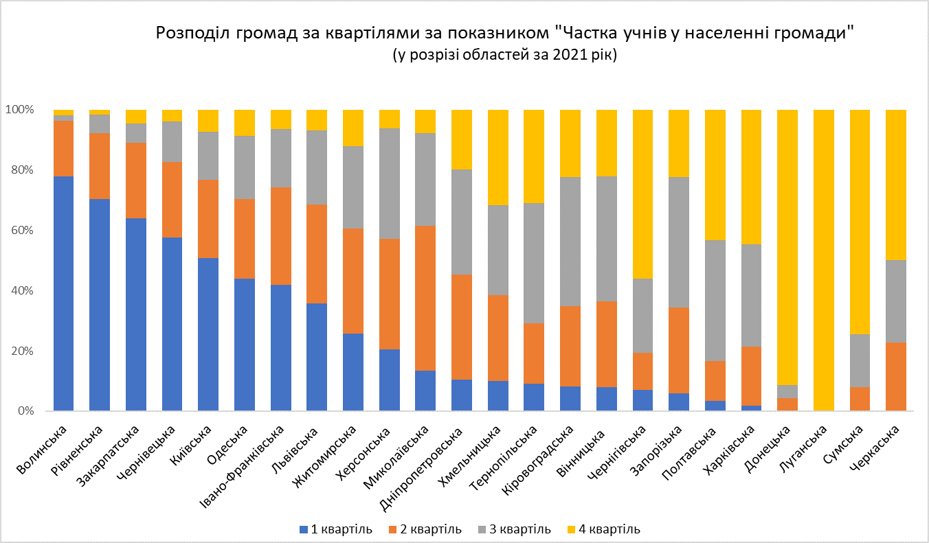 Дані свідчать, що серед усіх областей України найбільша частка громад за показником частки учнів у населенні громади, які розташовані у 1 квартилі – у Волинській області.