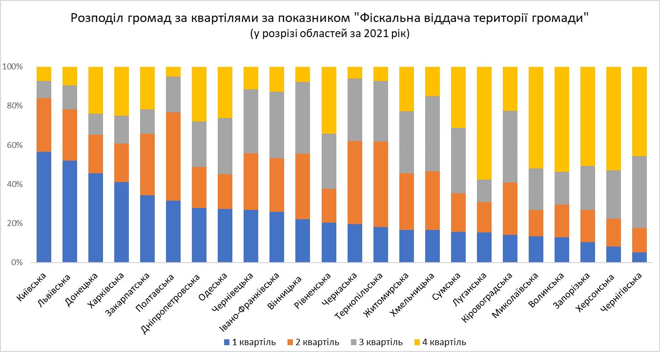 За показником фіскальної віддачі територій найбільша частка громад, які розташовані у 1 квартилі, – у Київській області.