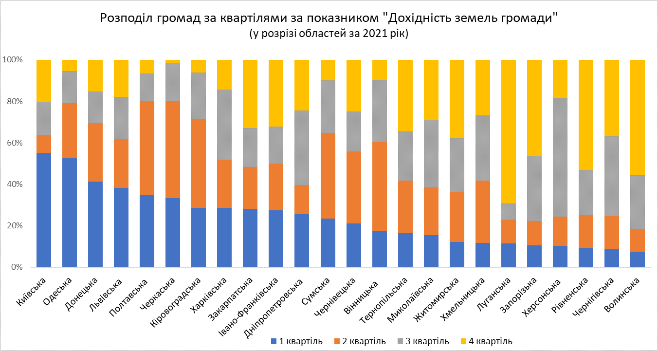За показником дохідності земель громади найбільша частка громад, які розташовані у 1 квартилі, - також у Київській області.