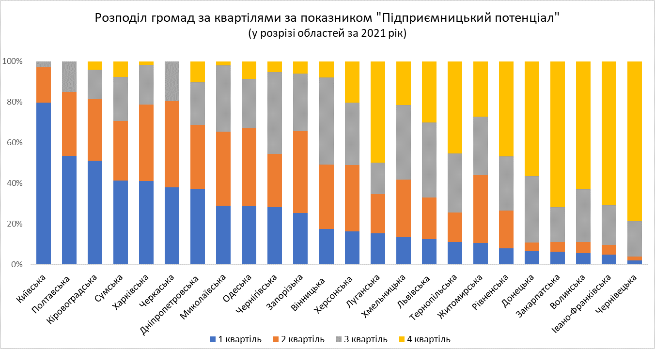 За показником підприємницького потенціалу найбільша частка громад, які розташовані у 1 квартилі, – у Київській області.