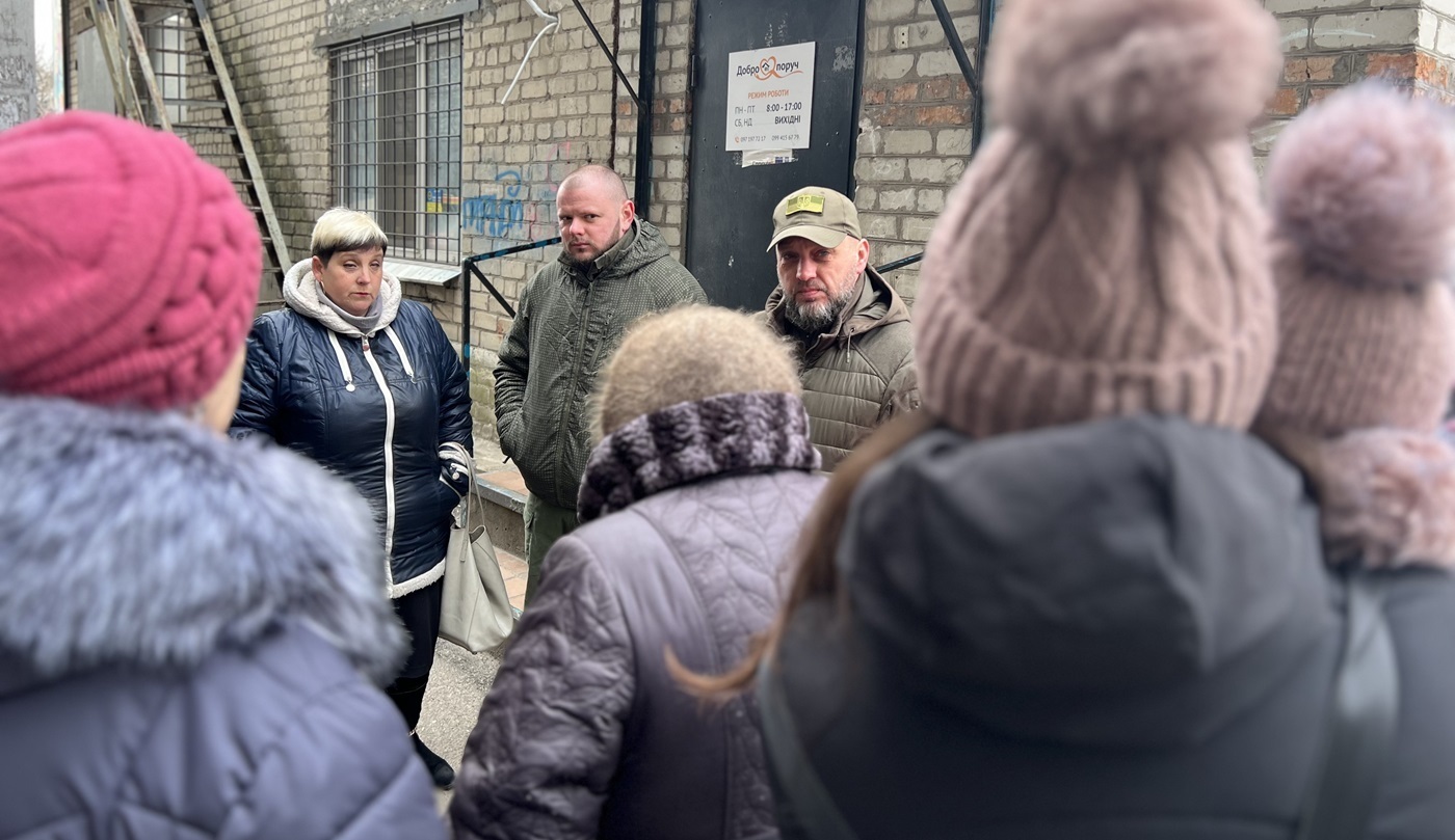 Віталій Барабаш спілкується з авдіївцями під час відкриття гуманітарного хабу в Новомосковську