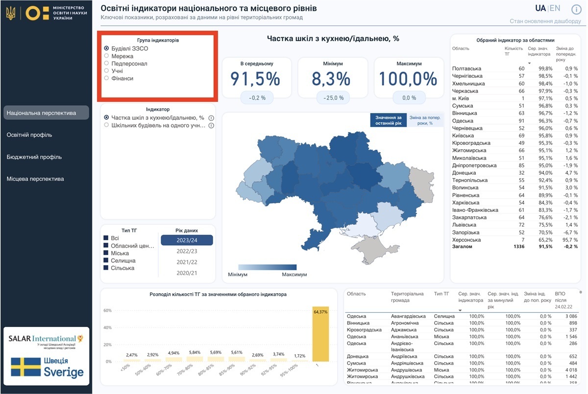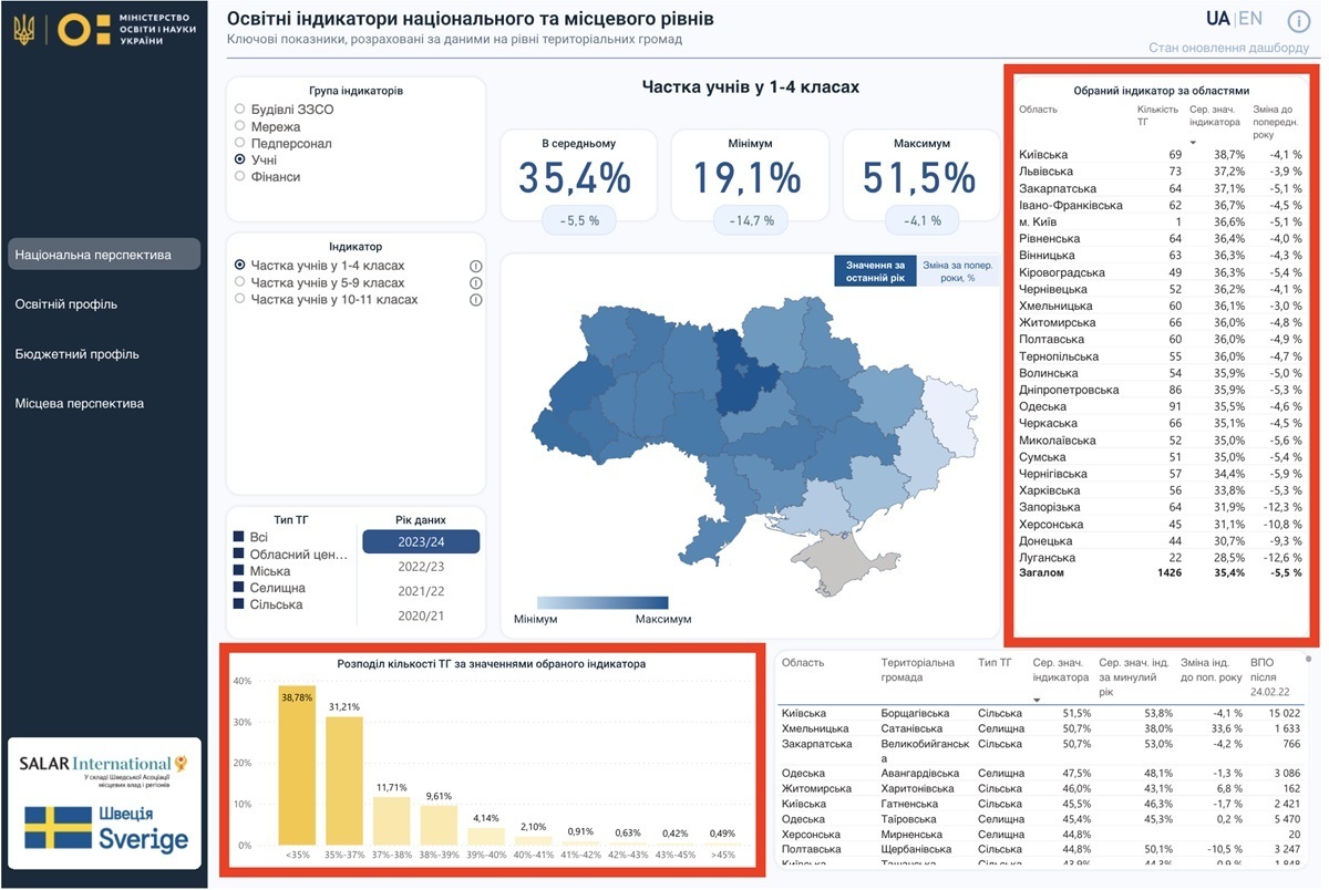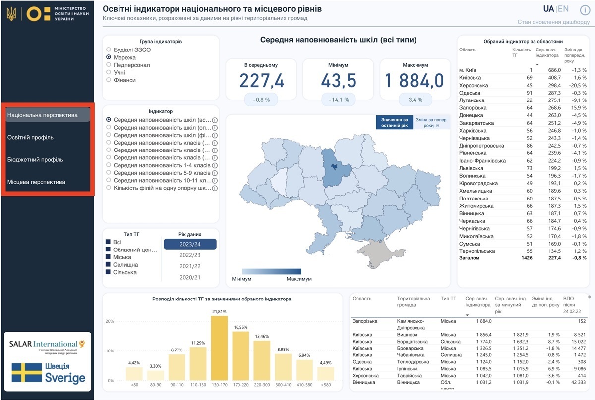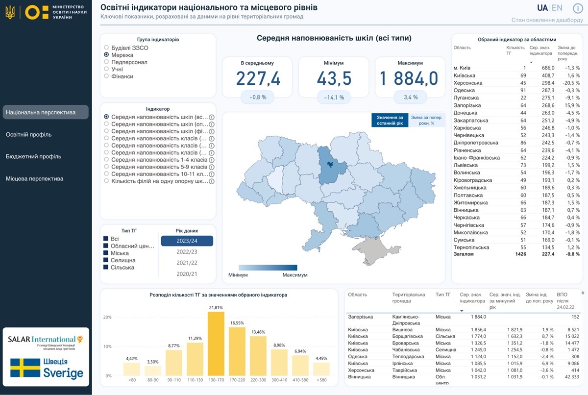 Переглянути освітню картину в регіонах та в Україні загалом, дізнатися про ключові характеристики місцевої шкільної мережі чи бюджетну ситуацію в тій чи тій громаді, проаналізувати наповнюваність класів – усе це (і більше) можна зробити на дашборді з освітніми індикаторами.