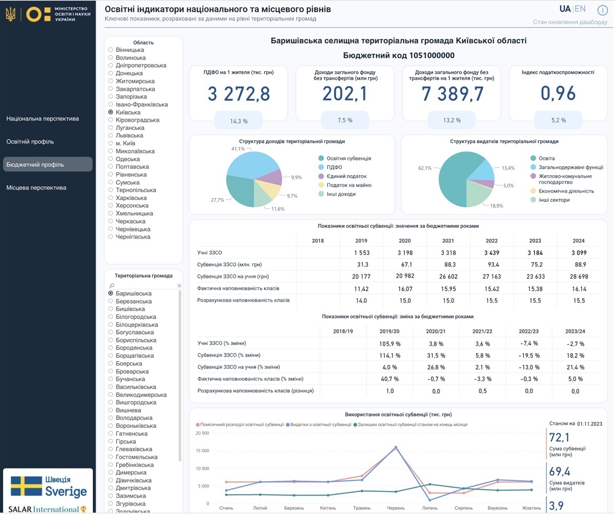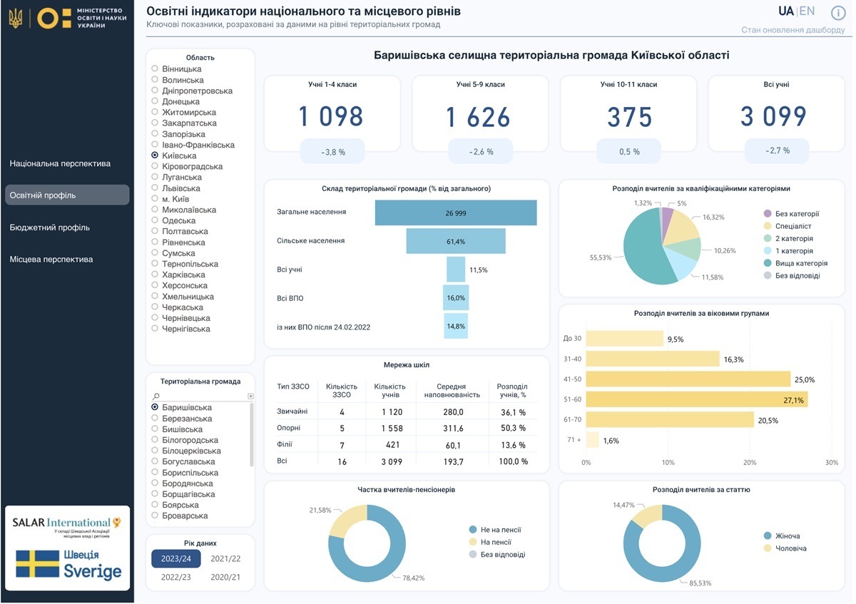 Інформаційна панель, яку розробили МОН у співпраці зі шведсько-українським проєктом «Підтримка децентралізації в Україні», стане в пригоді управлінцям, учителям, батькам, учням та всім, кому цікаво дослідити освітню сферу України за різними показниками та, наприклад, порівняти дані за областями чи громадами.