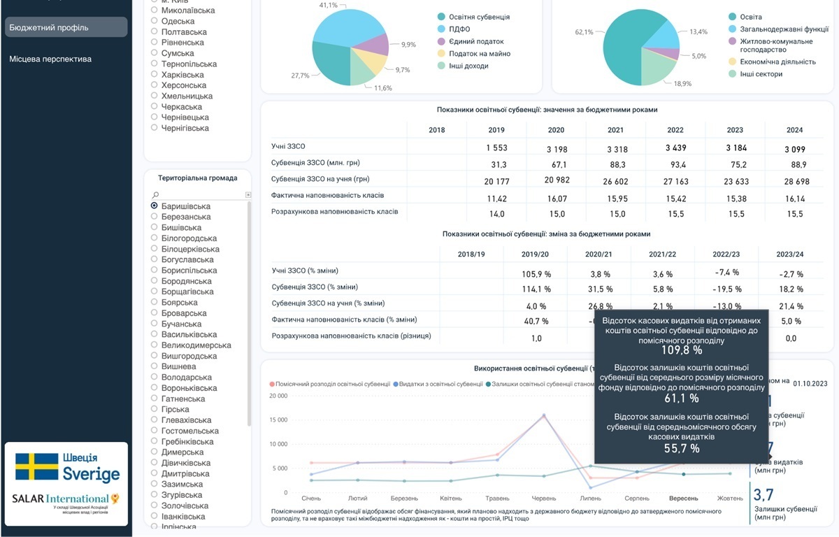 Скриншот дашборду сторінки «Бюджетний профіль» індикатора «Баришівська селищна територіальна громада Київської області» – «Показники освітньої субвенції»